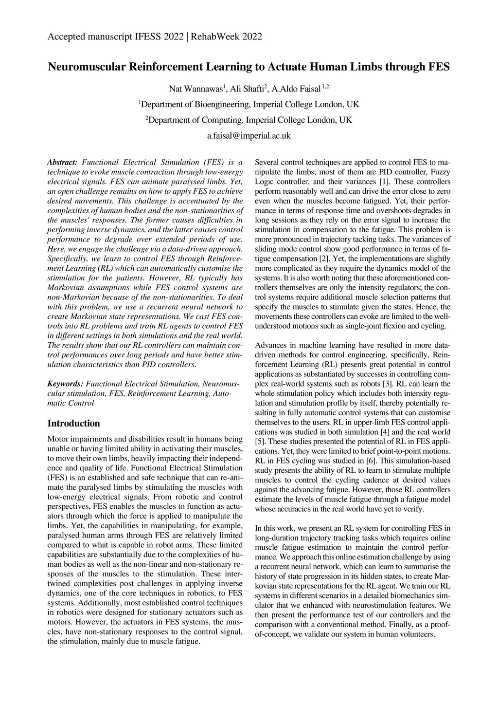 Neuromuscular Reinforcement Learning to Actuate Human Limbs through FES