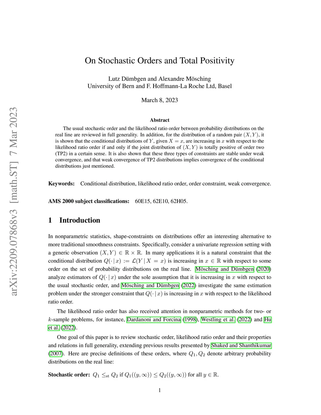 The usual stochastic order and the likelihood ratio order between probability distributions on the real line are reviewed in full generality. In addition, for the distribution of a random pair , it is shown that the conditional distributions of , given , are increasing in with respect to the likelihood ratio order if and only if the joint distribution of is totally positive of order two (TP2) in a certain sense. It is also shown that these three types of constraints are stable under weak convergence, and that weak convergence of TP2 distributions implies convergence of the conditional distributions just mentioned.