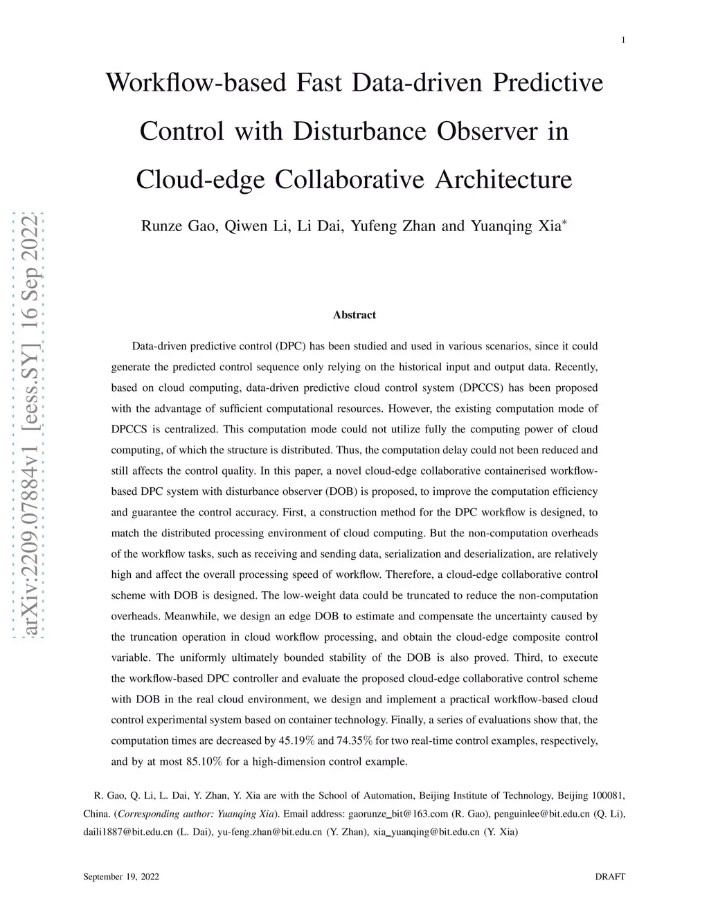 Data-driven predictive control (DPC) has been studied and used in various scenarios, since it could generate the predicted control sequence only relying on the historical input and output data. Recently, based on cloud computing, data-driven predictive cloud control system (DPCCS) has been proposed with the advantage of sufficient computational resources. However, the existing computation mode of DPCCS is centralized. This computation mode could not utilize fully the computing power of cloud computing, of which the structure is distributed. Thus, the computation delay could not been reduced and still affects the control quality. In this paper, a novel cloud-edge collaborative containerised workflow-based DPC system with disturbance observer (DOB) is proposed, to improve the computation efficiency and guarantee the control accuracy. First, a construction method for the DPC workflow is designed, to match the distributed processing environment of cloud computing. But the non-computation overheads of the workflow tasks are relatively high. Therefore, a cloud-edge collaborative control scheme with DOB is designed. The low-weight data could be truncated to reduce the non-computation overheads. Meanwhile, we design an edge DOB to estimate and compensate the uncertainty in cloud workflow processing, and obtain the composite control variable. The UUB stability of the DOB is also proved. Third, to execute the workflow-based DPC controller and evaluate the proposed cloud-edge collaborative control scheme with DOB in the real cloud environment, we design and implement a practical workflow-based cloud control experimental system based on container technology. Finally, a series of evaluations show that, the computation times are decreased by 45.19% and 74.35% for two real-time control examples, respectively, and by at most 85.10% for a high-dimension control example.