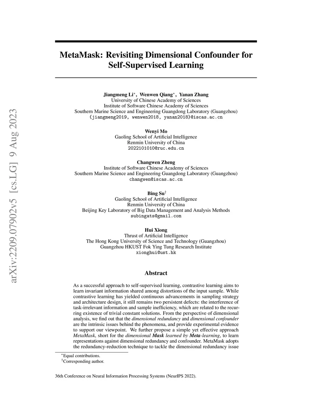 MetaMask: Revisiting Dimensional Confounder for Self-Supervised Learning