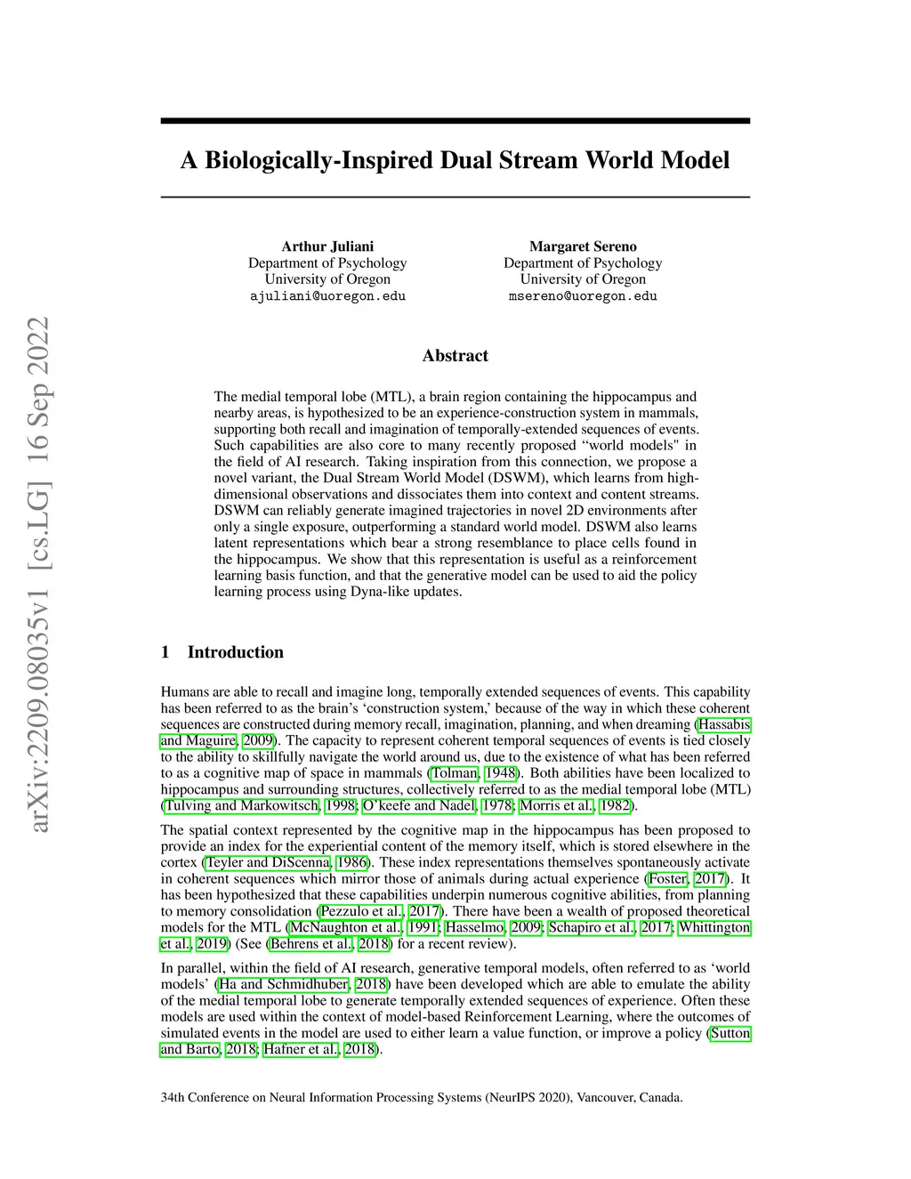 The medial temporal lobe (MTL), a brain region containing the hippocampus and nearby areas, is hypothesized to be an experience-construction system in mammals, supporting both recall and imagination of temporally-extended sequences of events. Such capabilities are also core to many recently proposed ``world models" in the field of AI research. Taking inspiration from this connection, we propose a novel variant, the Dual Stream World Model (DSWM), which learns from high-dimensional observations and dissociates them into context and content streams. DSWM can reliably generate imagined trajectories in novel 2D environments after only a single exposure, outperforming a standard world model. DSWM also learns latent representations which bear a strong resemblance to place cells found in the hippocampus. We show that this representation is useful as a reinforcement learning basis function, and that the generative model can be used to aid the policy learning process using Dyna-like updates.