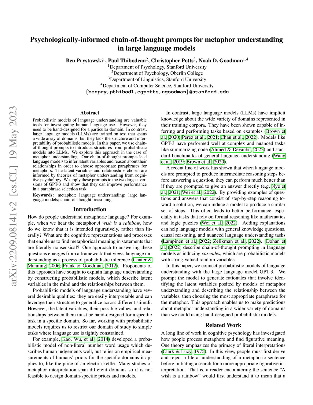 Probabilistic models of language understanding are valuable tools for investigating human language use. However, they need to be hand-designed for a particular domain. In contrast, large language models (LLMs) are trained on text that spans a wide array of domains, but they lack the structure and interpretability of probabilistic models. In this paper, we use chain-of-thought prompts to introduce structures from probabilistic models into LLMs. We explore this approach in the case of metaphor understanding. Our chain-of-thought prompts lead language models to infer latent variables and reason about their relationships in order to choose appropriate paraphrases for metaphors. The latent variables and relationships chosen are informed by theories of metaphor understanding from cognitive psychology. We apply these prompts to the two largest versions of GPT-3 and show that they can improve performance in a paraphrase selection task.