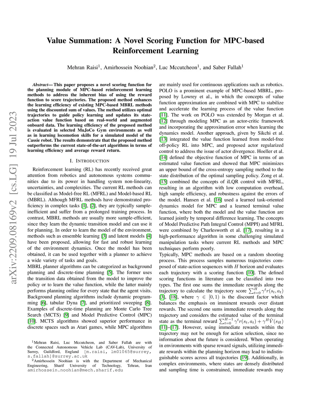 This paper proposes a novel scoring function for the planning module of MPC-based reinforcement learning methods to address the inherent bias of using the reward function to score trajectories. The proposed method enhances the learning efficiency of existing MPC-based MBRL methods using the discounted sum of values. The method utilizes optimal trajectories to guide policy learning and updates its state-action value function based on real-world and augmented onboard data. The learning efficiency of the proposed method is evaluated in selected MuJoCo Gym environments as well as in learning locomotion skills for a simulated model of the Cassie robot. The results demonstrate that the proposed method outperforms the current state-of-the-art algorithms in terms of learning efficiency and average reward return.