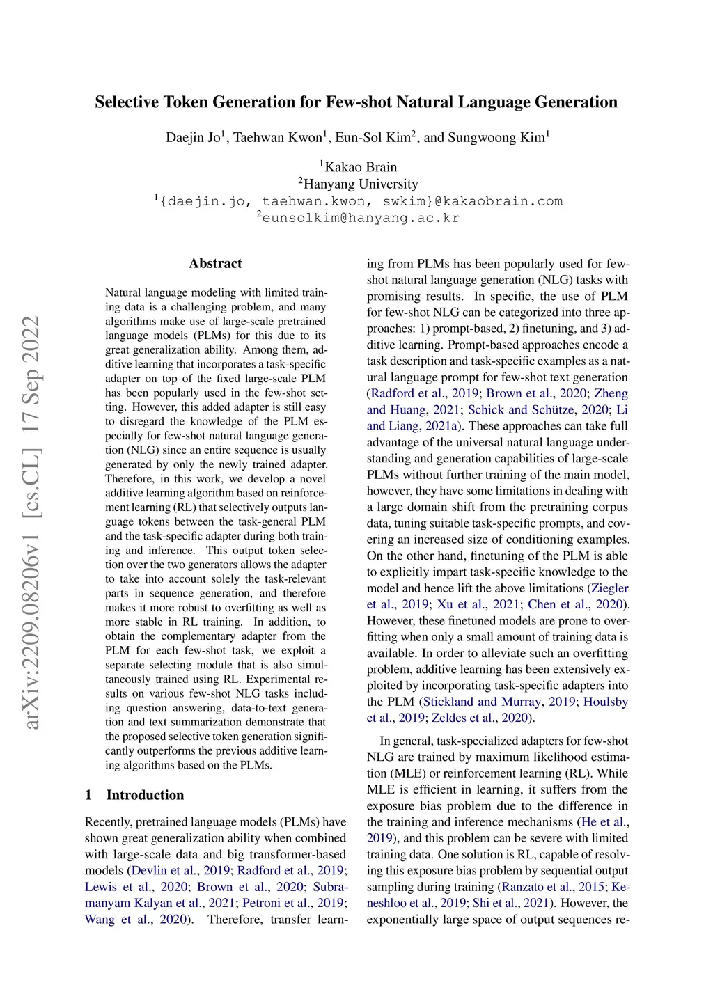 Natural language modeling with limited training data is a challenging problem, and many algorithms make use of large-scale pretrained language models (PLMs) for this due to its great generalization ability. Among them, additive learning that incorporates a task-specific adapter on top of the fixed large-scale PLM has been popularly used in the few-shot setting. However, this added adapter is still easy to disregard the knowledge of the PLM especially for few-shot natural language generation (NLG) since an entire sequence is usually generated by only the newly trained adapter. Therefore, in this work, we develop a novel additive learning algorithm based on reinforcement learning (RL) that selectively outputs language tokens between the task-general PLM and the task-specific adapter during both training and inference. This output token selection over the two generators allows the adapter to take into account solely the task-relevant parts in sequence generation, and therefore makes it more robust to overfitting as well as more stable in RL training. In addition, to obtain the complementary adapter from the PLM for each few-shot task, we exploit a separate selecting module that is also simultaneously trained using RL. Experimental results on various few-shot NLG tasks including question answering, data-to-text generation and text summarization demonstrate that the proposed selective token generation significantly outperforms the previous additive learning algorithms based on the PLMs.