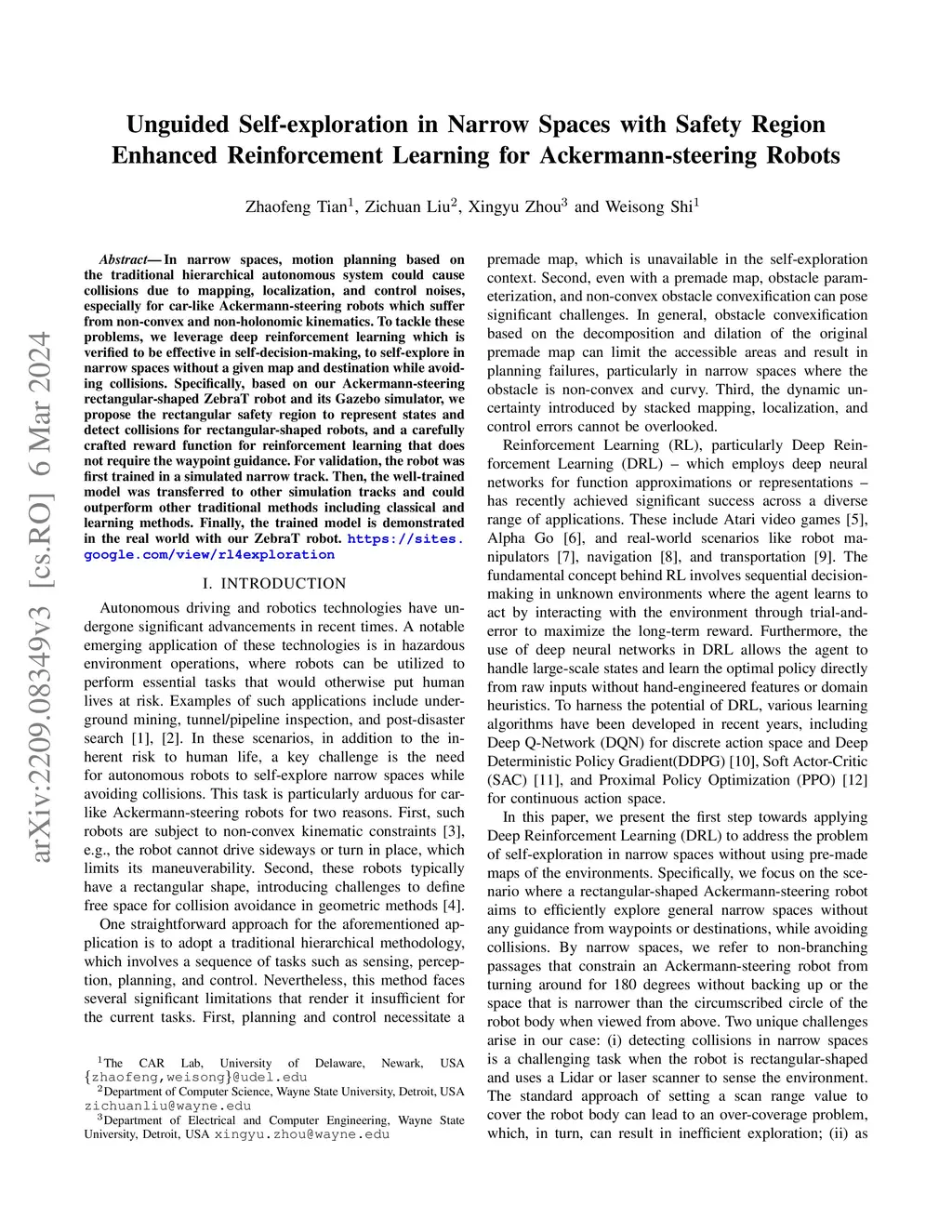 In narrow spaces, motion planning based on the traditional hierarchical autonomous system could cause collisions due to mapping, localization, and control noises, especially for car-like Ackermann-steering robots which suffer from non-convex and non-holonomic kinematics. To tackle these problems, we leverage deep reinforcement learning which is verified to be effective in self-decision-making, to self-explore in narrow spaces without a given map and destination while avoiding collisions. Specifically, based on our Ackermann-steering rectangular-shaped ZebraT robot and its Gazebo simulator, we propose the rectangular safety region to represent states and detect collisions for rectangular-shaped robots, and a carefully crafted reward function for reinforcement learning that does not require the waypoint guidance. For validation, the robot was first trained in a simulated narrow track. Then, the well-trained model was transferred to other simulation tracks and could outperform other traditional methods including classical and learning methods. Finally, the trained model is demonstrated in the real world with our ZebraT robot.