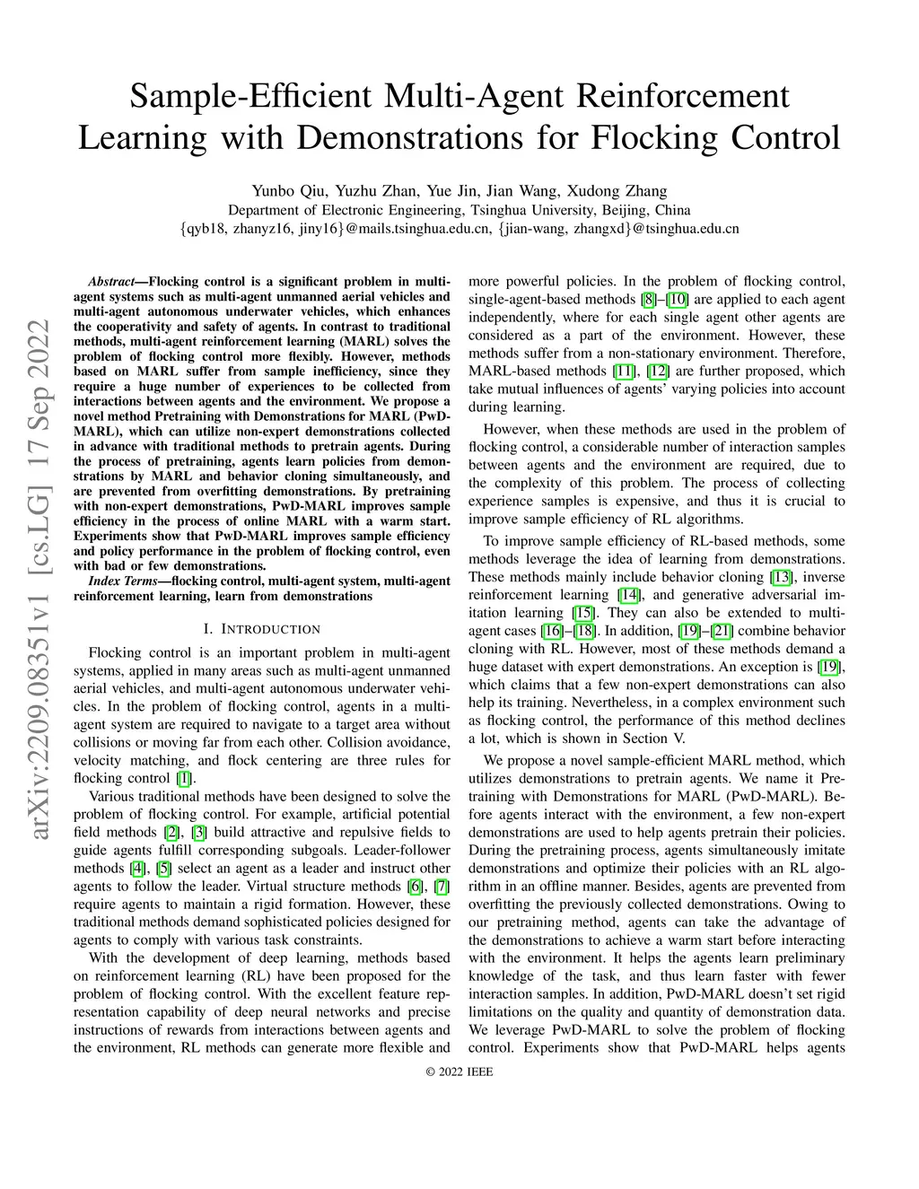 Flocking control is a significant problem in multi-agent systems such as multi-agent unmanned aerial vehicles and multi-agent autonomous underwater vehicles, which enhances the cooperativity and safety of agents. In contrast to traditional methods, multi-agent reinforcement learning (MARL) solves the problem of flocking control more flexibly. However, methods based on MARL suffer from sample inefficiency, since they require a huge number of experiences to be collected from interactions between agents and the environment. We propose a novel method Pretraining with Demonstrations for MARL (PwD-MARL), which can utilize non-expert demonstrations collected in advance with traditional methods to pretrain agents. During the process of pretraining, agents learn policies from demonstrations by MARL and behavior cloning simultaneously, and are prevented from overfitting demonstrations. By pretraining with non-expert demonstrations, PwD-MARL improves sample efficiency in the process of online MARL with a warm start. Experiments show that PwD-MARL improves sample efficiency and policy performance in the problem of flocking control, even with bad or few demonstrations.