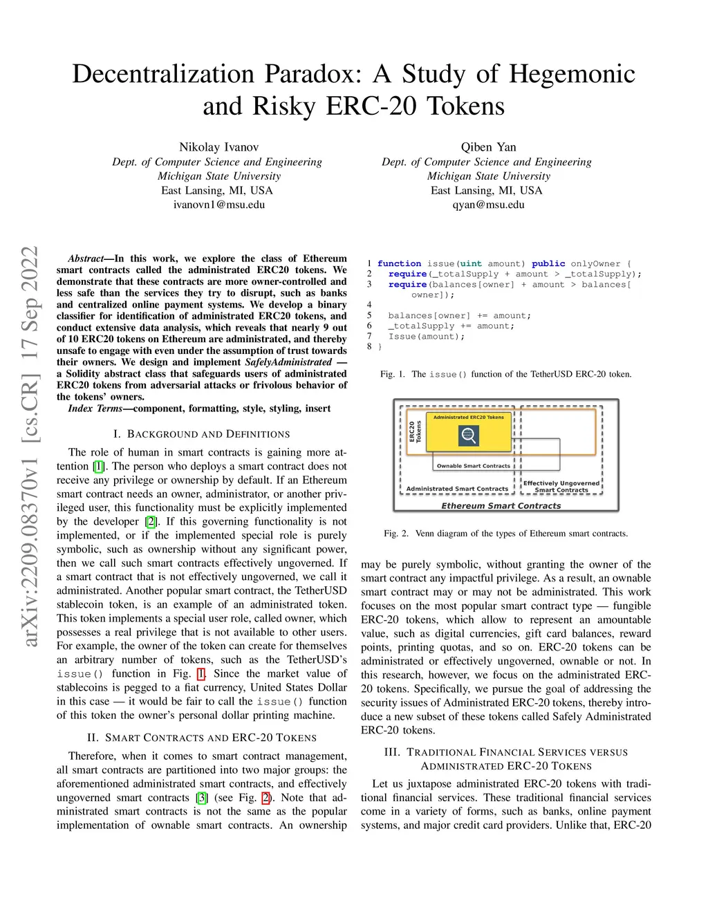 In this work, we explore the class of Ethereum smart contracts called the administrated ERC20 tokens. We demonstrate that these contracts are more owner-controlled and less safe than the services they try to disrupt, such as banks and centralized online payment systems. We develop a binary classifier for identification of administrated ERC20 tokens, and conduct extensive data analysis, which reveals that nearly 9 out of 10 ERC20 tokens on Ethereum are administrated, and thereby unsafe to engage with even under the assumption of trust towards their owners. We design and implement SafelyAdministrated - a Solidity abstract class that safeguards users of administrated ERC20 tokens from adversarial attacks or frivolous behavior of the tokens' owners.