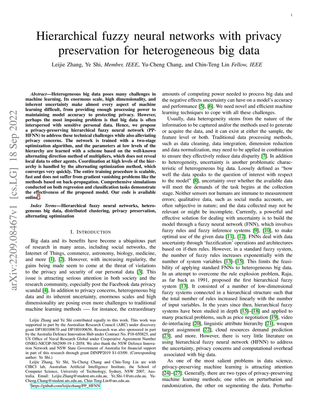 Heterogeneous big data poses many challenges in machine learning. Its enormous scale, high dimensionality, and inherent uncertainty make almost every aspect of machine learning difficult, from providing enough processing power to maintaining model accuracy to protecting privacy. However, perhaps the most imposing problem is that big data is often interspersed with sensitive personal data. Hence, we propose a privacy-preserving hierarchical fuzzy neural network (PP-HFNN) to address these technical challenges while also alleviating privacy concerns. The network is trained with a two-stage optimization algorithm, and the parameters at low levels of the hierarchy are learned with a scheme based on the well-known alternating direction method of multipliers, which does not reveal local data to other agents. Coordination at high levels of the hierarchy is handled by the alternating optimization method, which converges very quickly. The entire training procedure is scalable, fast and does not suffer from gradient vanishing problems like the methods based on back-propagation. Comprehensive simulations conducted on both regression and classification tasks demonstrate the effectiveness of the proposed model.