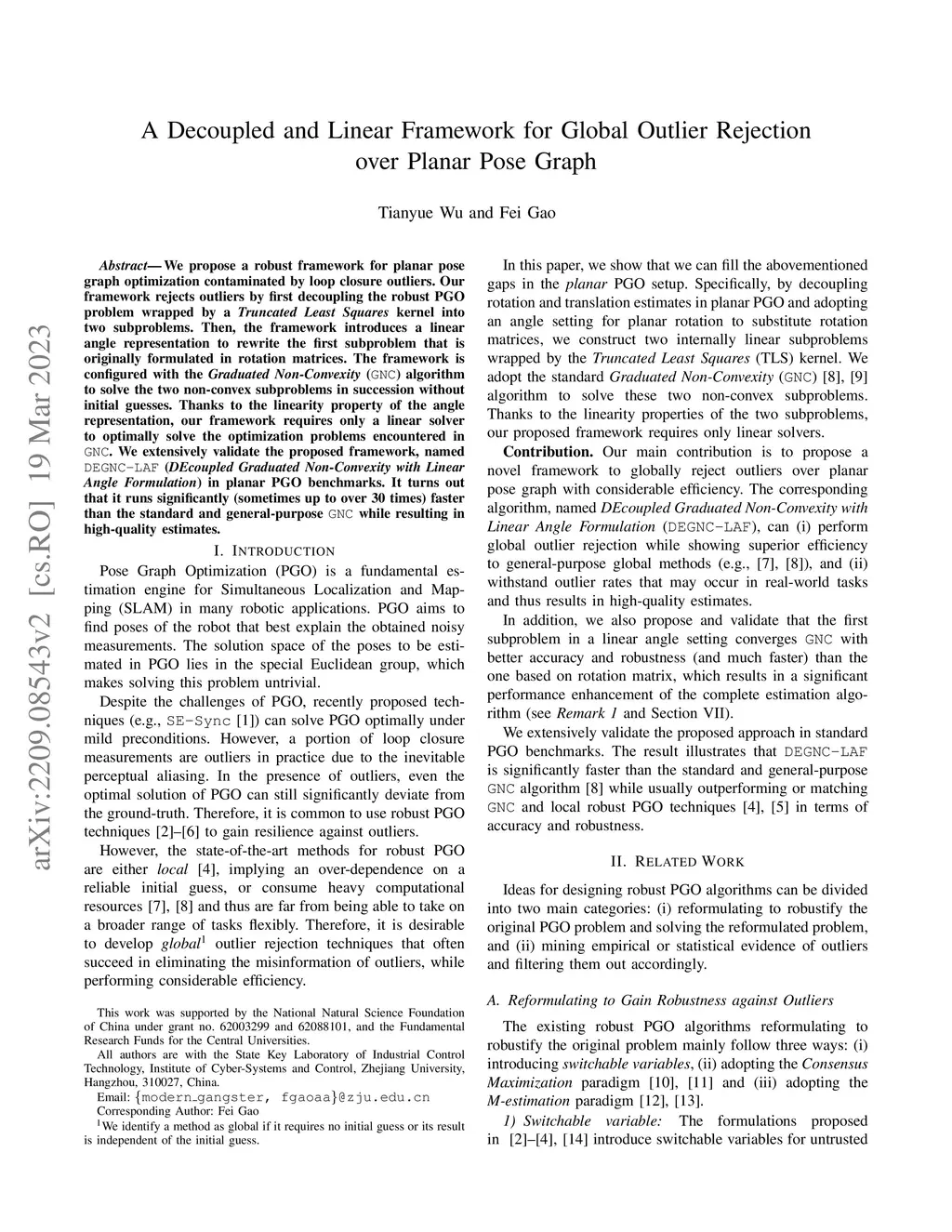 We propose a robust framework for the planar pose graph optimization contaminated by loop closure outliers. Our framework rejects outliers by first decoupling the robust PGO problem wrapped by a Truncated Least Squares kernel into two subproblems. Then, the framework introduces a linear angle representation to rewrite the first subproblem that is originally formulated with rotation matrices. The framework is configured with the Graduated Non-Convexity (GNC) algorithm to solve the two non-convex subproblems in succession without initial guesses. Thanks to the linearity properties of both the subproblems, our framework requires only linear solvers to optimally solve the optimization problems encountered in GNC. We extensively validate the proposed framework, named DEGNC-LAF (DEcoupled Graduated Non-Convexity with Linear Angle Formulation) in planar PGO benchmarks. It turns out that it runs significantly (sometimes up to over 30 times) faster than the standard and general-purpose GNC while resulting in high-quality estimates.
