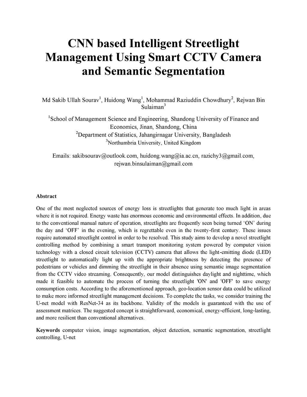 One of the most neglected sources of energy loss is streetlights which generate too much light in areas where it is not required. Energy waste has enormous economic and environmental effects. In addition, due to the conventional manual nature of the operation, streetlights are frequently seen being turned ON during the day and OFF in the evening, which is regrettable even in the twenty-first century. These issues require automated streetlight control in order to be resolved. This study aims to develop a novel streetlight controlling method by combining a smart transport monitoring system powered by computer vision technology with a closed circuit television (CCTV) camera that allows the light-emitting diode (LED) streetlight to automatically light up with the appropriate brightness by detecting the presence of pedestrians or vehicles and dimming the streetlight in their absence using semantic image segmentation from the CCTV video streaming. Consequently, our model distinguishes daylight and nighttime, which made it feasible to automate the process of turning the streetlight ÓN' and ÓFF' to save energy consumption costs. According to the aforementioned approach, geolocation sensor data could be utilized to make more informed streetlight management decisions. To complete the tasks, we consider training the U-net model with ResNet-34 as its backbone. The validity of the models is guaranteed with the use of assessment matrices. The suggested concept is straightforward, economical, energy-efficient, long-lasting, and more resilient than conventional alternatives.