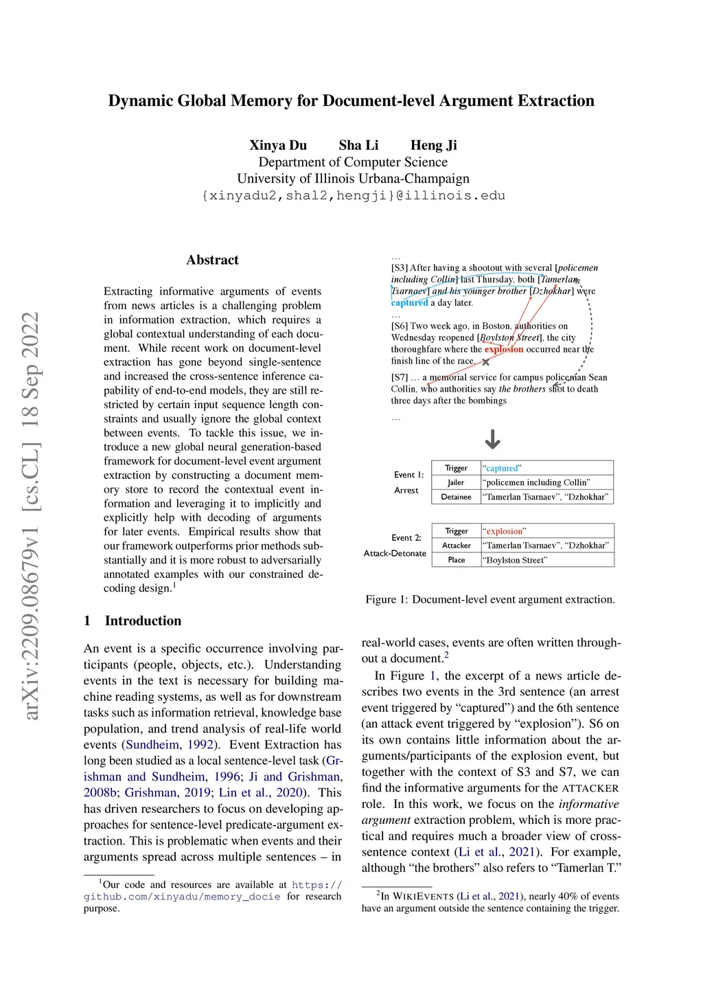 Extracting informative arguments of events from news articles is a challenging problem in information extraction, which requires a global contextual understanding of each document. While recent work on document-level extraction has gone beyond single-sentence and increased the cross-sentence inference capability of end-to-end models, they are still restricted by certain input sequence length constraints and usually ignore the global context between events. To tackle this issue, we introduce a new global neural generation-based framework for document-level event argument extraction by constructing a document memory store to record the contextual event information and leveraging it to implicitly and explicitly help with decoding of arguments for later events. Empirical results show that our framework outperforms prior methods substantially and it is more robust to adversarially annotated examples with our constrained decoding design. (Our code and resources are available at https://github.com/xinyadu/memory_docie for research purpose.)
