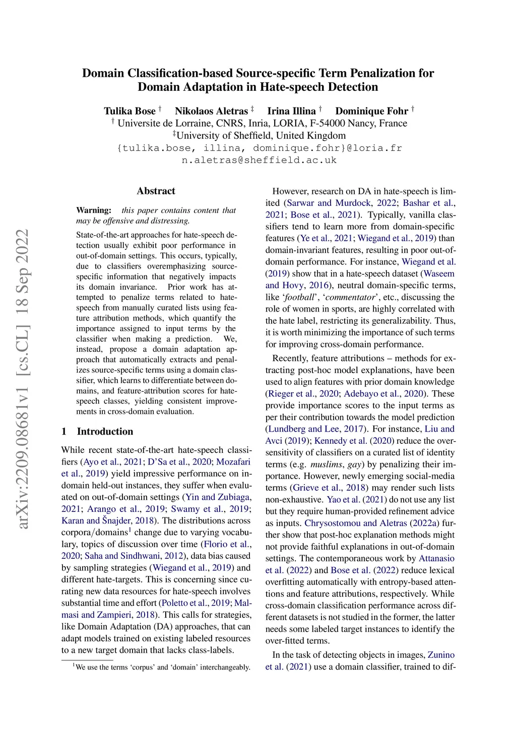 State-of-the-art approaches for hate-speech detection usually exhibit poor performance in out-of-domain settings. This occurs, typically, due to classifiers overemphasizing source-specific information that negatively impacts its domain invariance. Prior work has attempted to penalize terms related to hate-speech from manually curated lists using feature attribution methods, which quantify the importance assigned to input terms by the classifier when making a prediction. We, instead, propose a domain adaptation approach that automatically extracts and penalizes source-specific terms using a domain classifier, which learns to differentiate between domains, and feature-attribution scores for hate-speech classes, yielding consistent improvements in cross-domain evaluation.