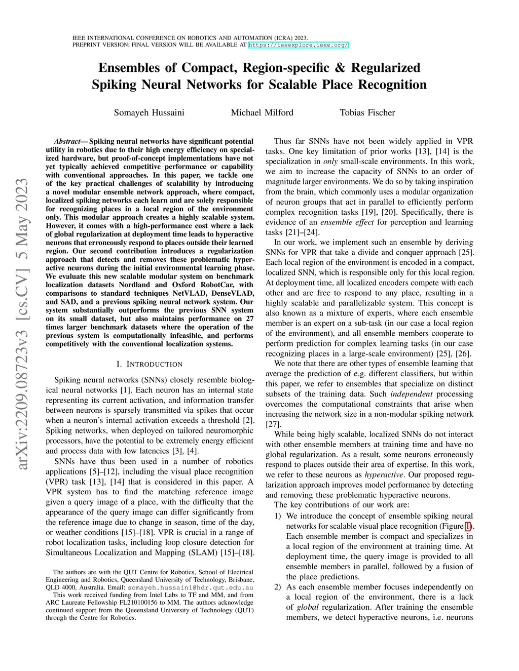 Spiking neural networks have significant potential utility in robotics due to their high energy efficiency on specialized hardware, but proof-of-concept implementations have not yet typically achieved competitive performance or capability with conventional approaches. In this paper, we tackle one of the key practical challenges of scalability by introducing a novel modular ensemble network approach, where compact, localized spiking networks each learn and are solely responsible for recognizing places in a local region of the environment only. This modular approach creates a highly scalable system. However, it comes with a high-performance cost where a lack of global regularization at deployment time leads to hyperactive neurons that erroneously respond to places outside their learned region. Our second contribution introduces a regularization approach that detects and removes these problematic hyperactive neurons during the initial environmental learning phase. We evaluate this new scalable modular system on benchmark localization datasets Nordland and Oxford RobotCar, with comparisons to standard techniques NetVLAD, DenseVLAD, and SAD, and a previous spiking neural network system. Our system substantially outperforms the previous SNN system on its small dataset, but also maintains performance on 27 times larger benchmark datasets where the operation of the previous system is computationally infeasible, and performs competitively with the conventional localization systems.
