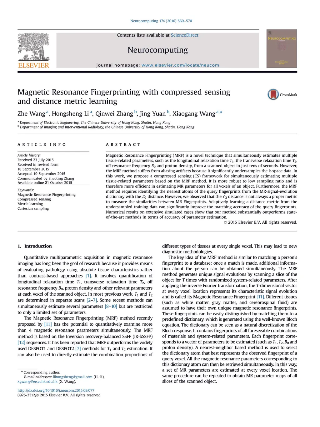 Magnetic Resonance Fingerprinting (MRF) is a novel technique that simultaneously estimates multiple tissue-related parameters, such as the longitudinal relaxation time T1, the transverse relaxation time T2, off resonance frequency B0 and proton density, from a scanned object in just tens of seconds. However, the MRF method suffers from aliasing artifacts because it significantly undersamples the k-space data. In this work, we propose a compressed sensing (CS) framework for simultaneously estimating multiple tissue-related parameters based on the MRF method. It is more robust to low sampling ratio and is therefore more efficient in estimating MR parameters for all voxels of an object. Furthermore, the MRF method requires identifying the nearest atoms of the query fingerprints from the MR-signal-evolution dictionary with the L2 distance. However, we observed that the L2 distance is not always a proper metric to measure the similarities between MR Fingerprints. Adaptively learning a distance metric from the undersampled training data can significantly improve the matching accuracy of the query fingerprints. Numerical results on extensive simulated cases show that our method substantially outperforms stateof-the-art methods in terms of accuracy of parameter estimation.