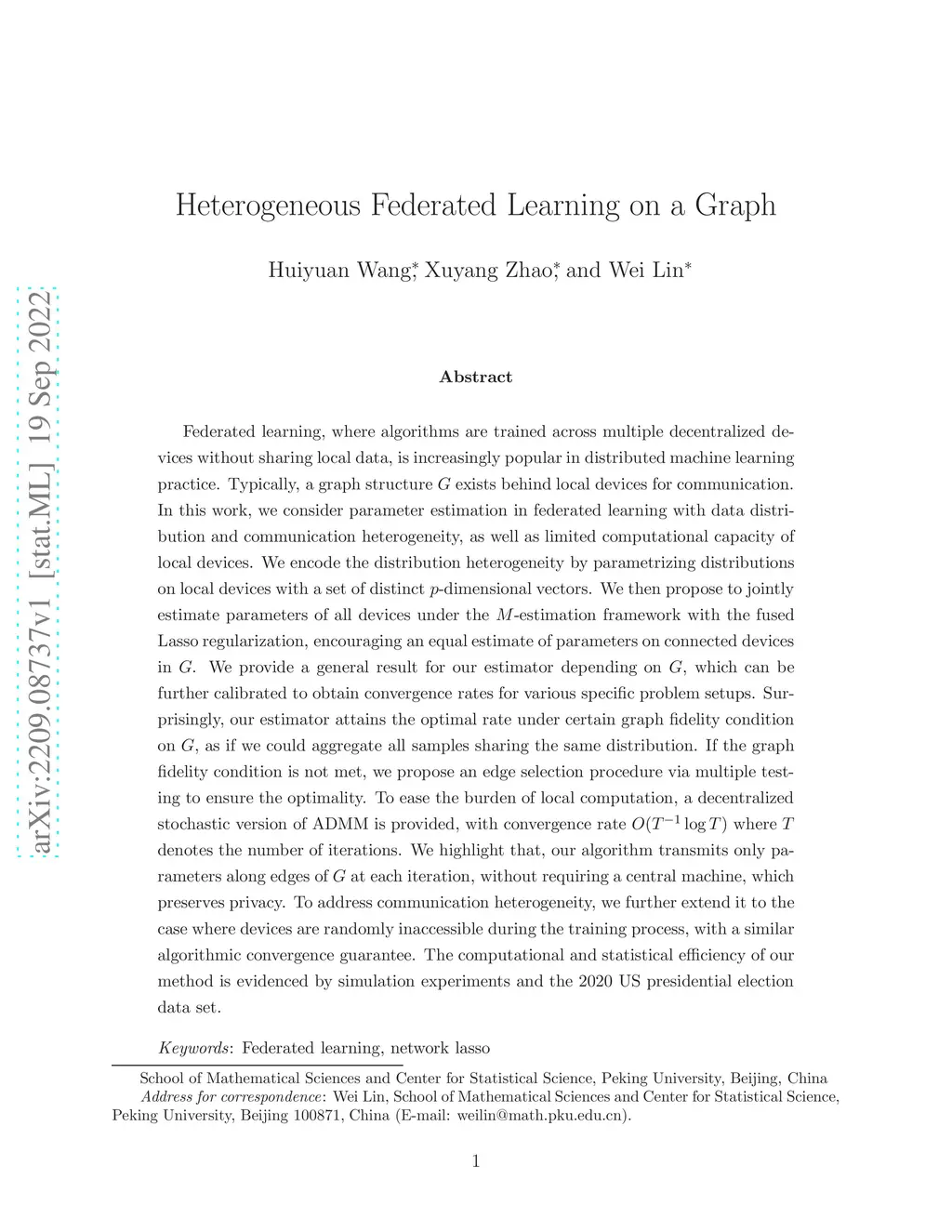 Federated learning, where algorithms are trained across multiple decentralized devices without sharing local data, is increasingly popular in distributed machine learning practice. Typically, a graph structure exists behind local devices for communication. In this work, we consider parameter estimation in federated learning with data distribution and communication heterogeneity, as well as limited computational capacity of local devices. We encode the distribution heterogeneity by parametrizing distributions on local devices with a set of distinct -dimensional vectors. We then propose to jointly estimate parameters of all devices under the -estimation framework with the fused Lasso regularization, encouraging an equal estimate of parameters on connected devices in . We provide a general result for our estimator depending on , which can be further calibrated to obtain convergence rates for various specific problem setups. Surprisingly, our estimator attains the optimal rate under certain graph fidelity condition on , as if we could aggregate all samples sharing the same distribution. If the graph fidelity condition is not met, we propose an edge selection procedure via multiple testing to ensure the optimality. To ease the burden of local computation, a decentralized stochastic version of ADMM is provided, with convergence rate where denotes the number of iterations. We highlight that, our algorithm transmits only parameters along edges of at each iteration, without requiring a central machine, which preserves privacy. We further extend it to the case where devices are randomly inaccessible during the training process, with a similar algorithmic convergence guarantee. The computational and statistical efficiency of our method is evidenced by simulation experiments and the 2020 US presidential election data set.