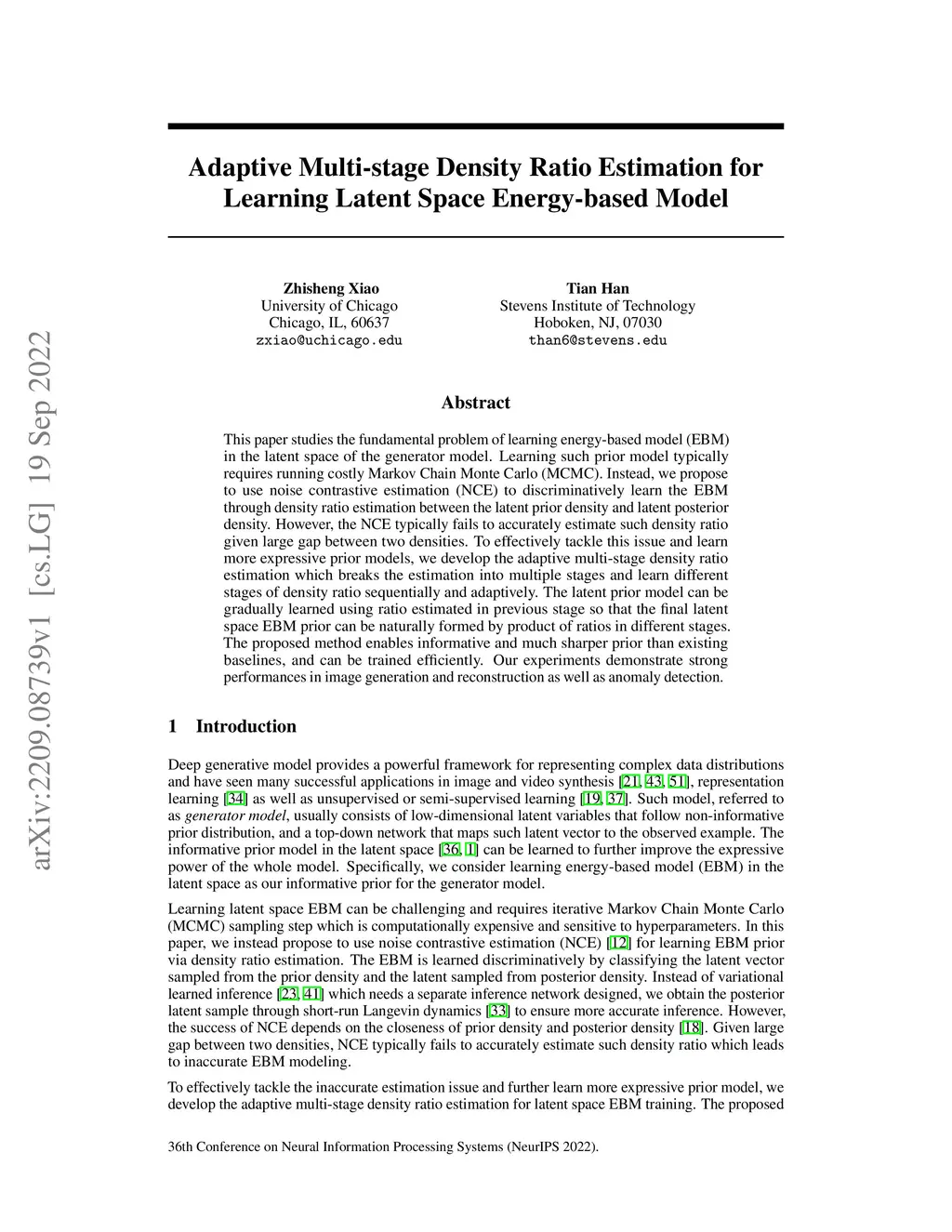 Adaptive Multi-stage Density Ratio Estimation for Learning Latent Space