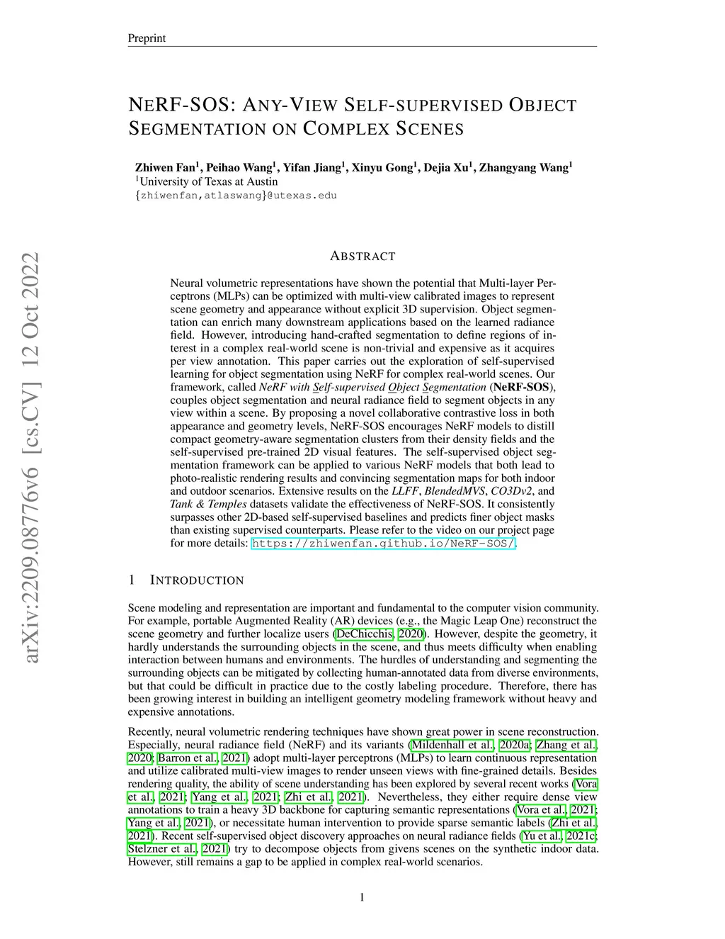 Neural volumetric representations have shown the potential that Multi-layer Perceptrons (MLPs) can be optimized with multi-view calibrated images to represent scene geometry and appearance, without explicit 3D supervision. Object segmentation can enrich many downstream applications based on the learned radiance field. However, introducing hand-crafted segmentation to define regions of interest in a complex real-world scene is non-trivial and expensive as it acquires per view annotation. This paper carries out the exploration of self-supervised learning for object segmentation using NeRF for complex real-world scenes. Our framework, called NeRF with Self-supervised Object Segmentation NeRF-SOS, couples object segmentation and neural radiance field to segment objects in any view within a scene. By proposing a novel collaborative contrastive loss in both appearance and geometry levels, NeRF-SOS encourages NeRF models to distill compact geometry-aware segmentation clusters from their density fields and the self-supervised pre-trained 2D visual features. The self-supervised object segmentation framework can be applied to various NeRF models that both lead to photo-realistic rendering results and convincing segmentation maps for both indoor and outdoor scenarios. Extensive results on the LLFF, Tank & Temple, and BlendedMVS datasets validate the effectiveness of NeRF-SOS. It consistently surpasses other 2D-based self-supervised baselines and predicts finer semantics masks than existing supervised counterparts. Please refer to the video on our project page for more details:https://zhiwenfan.github.io/NeRF-SOS.
