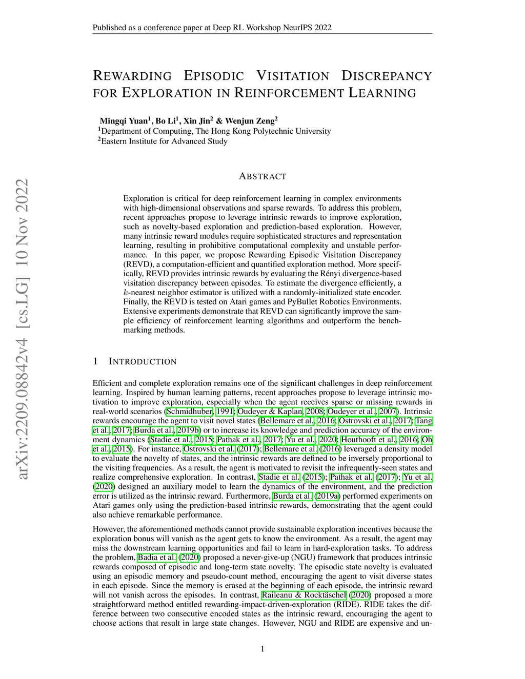 Exploration is critical for deep reinforcement learning in complex environments with high-dimensional observations and sparse rewards. To address this problem, recent approaches proposed to leverage intrinsic rewards to improve exploration, such as novelty-based exploration and prediction-based exploration. However, many intrinsic reward modules require sophisticated structures and representation learning, resulting in prohibitive computational complexity and unstable performance. In this paper, we propose Rewarding Episodic Visitation Discrepancy (REVD), a computation-efficient and quantified exploration method. More specifically, REVD provides intrinsic rewards by evaluating the R\ényi divergence-based visitation discrepancy between episodes. To make efficient divergence estimation, a k-nearest neighbor estimator is utilized with a randomly-initialized state encoder. Finally, the REVD is tested on Atari games and PyBullet Robotics Environments. Extensive experiments demonstrate that REVD can significantly improves the sample efficiency of reinforcement learning algorithms and outperforms the benchmarking methods.