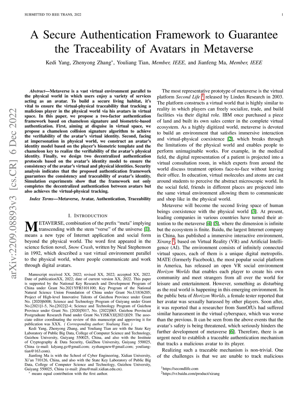 Metaverse is a vast virtual environment parallel to the physical world in which users enjoy a variety of services acting as an avatar. To build a secure living habitat, it's vital to ensure the virtual-physical traceability that tracking a malicious player in the physical world via his avatars in virtual space. In this paper, we propose a two-factor authentication framework based on chameleon signature and biometric-based authentication. First, aiming at disguise in virtual space, we propose a chameleon collision signature algorithm to achieve the verifiability of the avatar's virtual identity. Second, facing at impersonation in physical world, we construct an avatar's identity model based on the player's biometric template and the chameleon key to realize the verifiability of the avatar's physical identity. Finally, we design two decentralized authentication protocols based on the avatar's identity model to ensure the consistency of the avatar's virtual and physical identities. Security analysis indicates that the proposed authentication framework guarantees the consistency and traceability of avatar's identity. Simulation experiments show that the framework not only completes the decentralized authentication between avatars but also achieves the virtual-physical tracking.