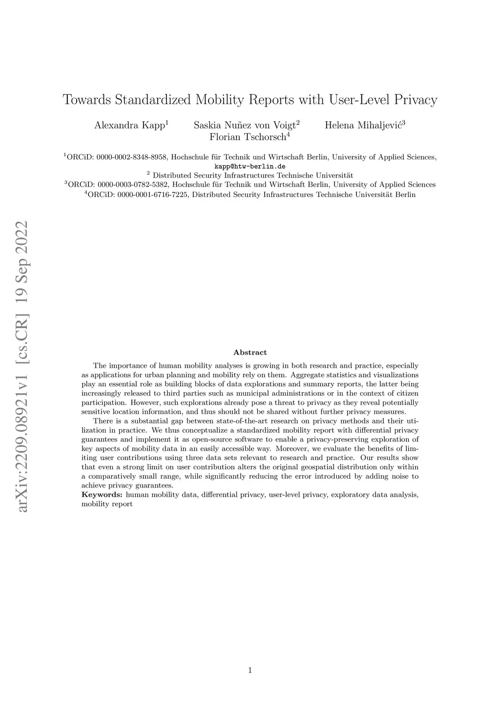 The importance of human mobility analyses is growing in both research and practice, especially as applications for urban planning and mobility rely on them. Aggregate statistics and visualizations play an essential role as building blocks of data explorations and summary reports, the latter being increasingly released to third parties such as municipal administrations or in the context of citizen participation. However, such explorations already pose a threat to privacy as they reveal potentially sensitive location information, and thus should not be shared without further privacy measures. There is a substantial gap between state-of-the-art research on privacy methods and their utilization in practice. We thus conceptualize a standardized mobility report with differential privacy guarantees and implement it as open-source software to enable a privacy-preserving exploration of key aspects of mobility data in an easily accessible way. Moreover, we evaluate the benefits of limiting user contributions using three data sets relevant to research and practice. Our results show that even a strong limit on user contribution alters the original geospatial distribution only within a comparatively small range, while significantly reducing the error introduced by adding noise to achieve privacy guarantees.