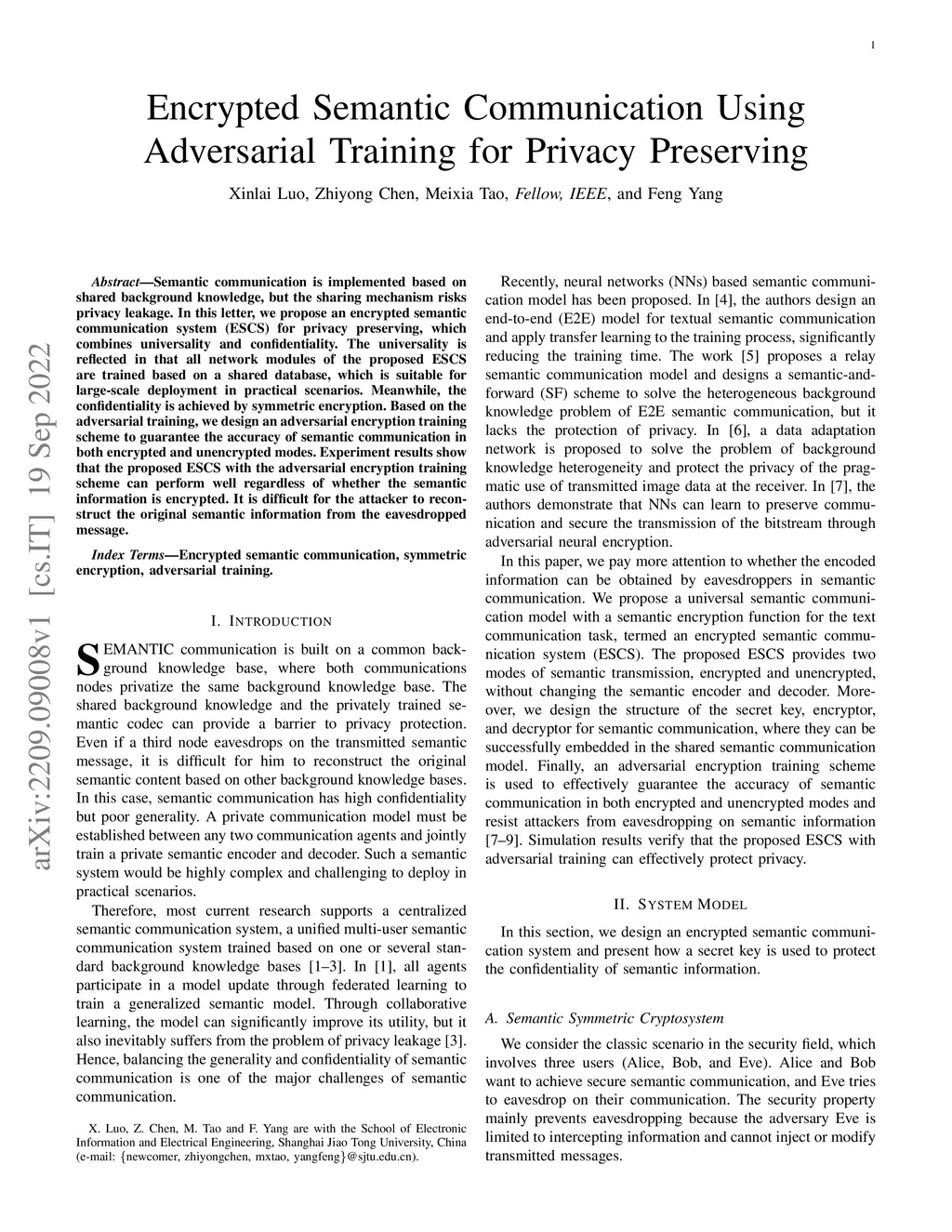 Encrypted Semantic Communication Using Adversarial Training for Privacy