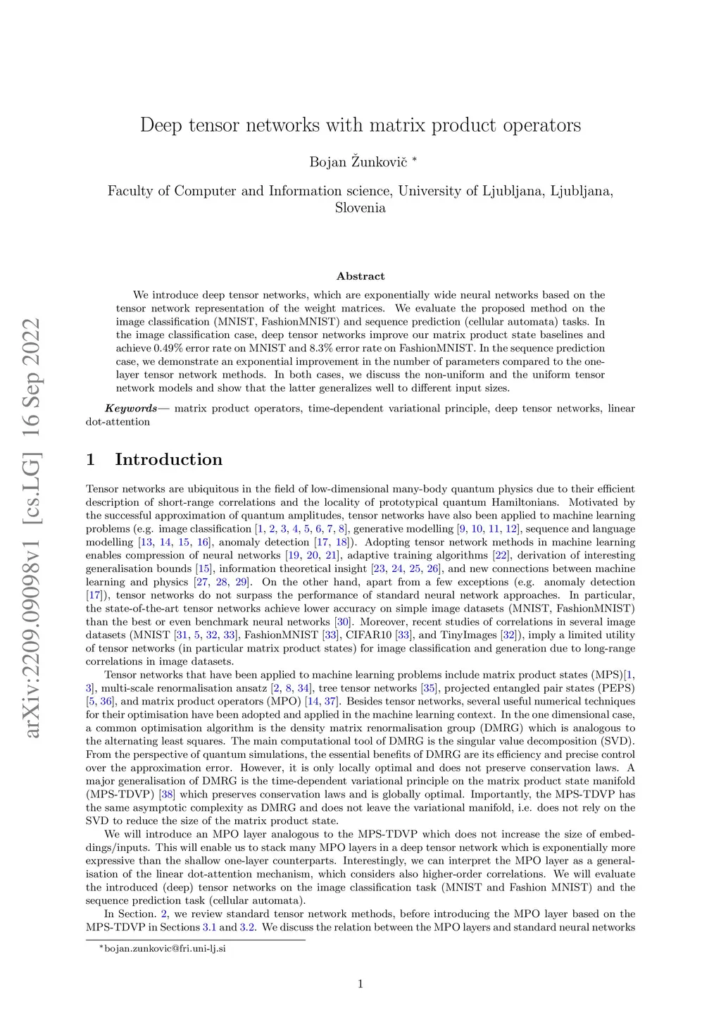 Deep tensor networks with matrix product operators