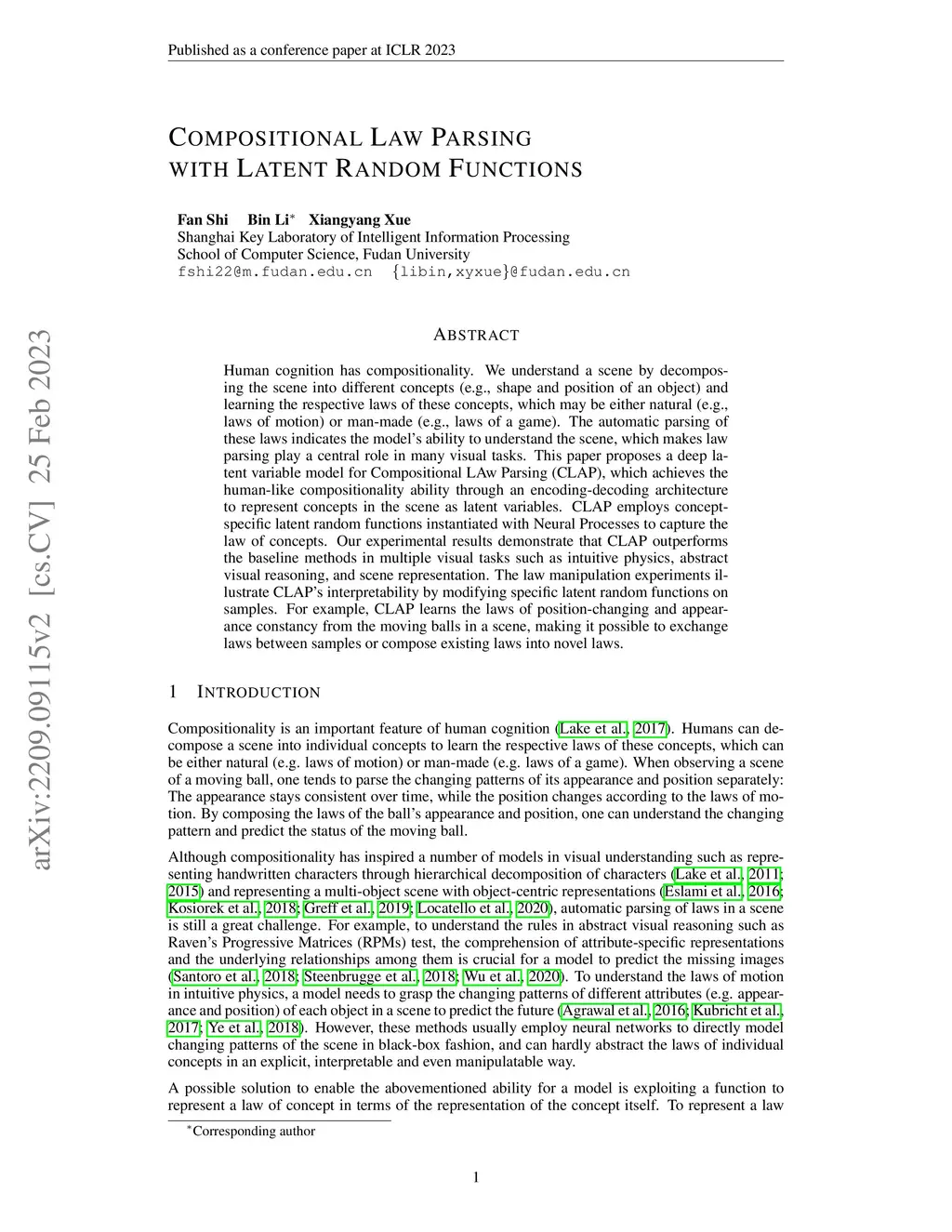 Human cognition has compositionality. We understand a scene by decomposing the scene into different concepts (e.g., shape and position of an object) and learning the respective laws of these concepts, which may be either natural (e.g., laws of motion) or man-made (e.g., laws of a game). The automatic parsing of these laws indicates the model's ability to understand the scene, which makes law parsing play a central role in many visual tasks. This paper proposes a deep latent variable model for Compositional LAw Parsing (CLAP), which achieves the human-like compositionality ability through an encoding-decoding architecture to represent concepts in the scene as latent variables. CLAP employs concept-specific latent random functions instantiated with Neural Processes to capture the law of concepts. Our experimental results demonstrate that CLAP outperforms the baseline methods in multiple visual tasks such as intuitive physics, abstract visual reasoning, and scene representation. The law manipulation experiments illustrate CLAP's interpretability by modifying specific latent random functions on samples. For example, CLAP learns the laws of position-changing and appearance constancy from the moving balls in a scene, making it possible to exchange laws between samples or compose existing laws into novel laws.