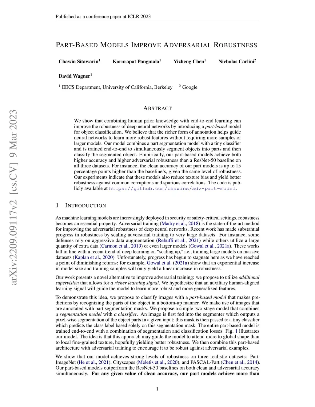 We show that combining human prior knowledge with end-to-end learning can improve the robustness of deep neural networks by introducing a part-based model for object classification. We believe that the richer form of annotation helps guide neural networks to learn more robust features without requiring more samples or larger models. Our model combines a part segmentation model with a tiny classifier and is trained end-to-end to simultaneously segment objects into parts and then classify the segmented object. Empirically, our part-based models achieve both higher accuracy and higher adversarial robustness than a ResNet-50 baseline on all three datasets. For instance, the clean accuracy of our part models is up to 15 percentage points higher than the baseline's, given the same level of robustness. Our experiments indicate that these models also reduce texture bias and yield better robustness against common corruptions and spurious correlations. The code is publicly available at https://github.com/chawins/adv-part-model.