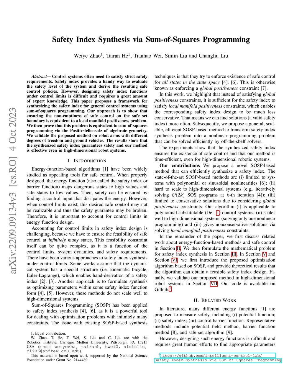 Control systems often need to satisfy strict safety requirements. Safety index provides a handy way to evaluate the safety level of the system and derive the resulting safe control policies. However, designing safety index functions under control limits is difficult and requires a great amount of expert knowledge. This paper proposes a framework for synthesizing the safety index for general control systems using sum-of-squares programming. Our approach is to show that ensuring the non-emptiness of safe control on the safe set boundary is equivalent to a local manifold positiveness problem. We then prove that this problem is equivalent to sum-of-squares programming via the Positivstellensatz of algebraic geometry. We validate the proposed method on robot arms with different degrees of freedom and ground vehicles. The results show that the synthesized safety index guarantees safety and our method is effective even in high-dimensional robot systems.