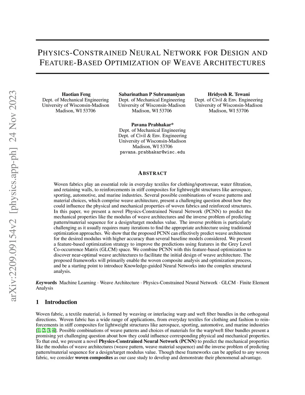 Woven fabrics play an essential role in everyday textiles for clothing/sportswear, water filtration, and retaining walls, to reinforcements in stiff composites for lightweight structures like aerospace, sporting, automotive, and marine industries. Several possible combinations of weave patterns and material choices, which comprise weave architecture, present a challenging question about how they could influence the physical and mechanical properties of woven fabrics and reinforced structures. In this paper, we present a novel Physics-Constrained Neural Network (PCNN) to predict the mechanical properties like the modulus of weave architectures and the inverse problem of predicting pattern/material sequence for a design/target modulus value. The inverse problem is particularly challenging as it usually requires many iterations to find the appropriate architecture using traditional optimization approaches. We show that the proposed PCNN can effectively predict weave architecture for the desired modulus with higher accuracy than several baseline models considered. We present a feature-based optimization strategy to improve the predictions using features in the Grey Level Co-occurrence Matrix (GLCM) space. We combine PCNN with this feature-based optimization to discover near-optimal weave architectures to facilitate the initial design of weave architecture. The proposed frameworks will primarily enable the woven composite analysis and optimization process, and be a starting point to introduce Knowledge-guided Neural Networks into the complex structural analysis.
