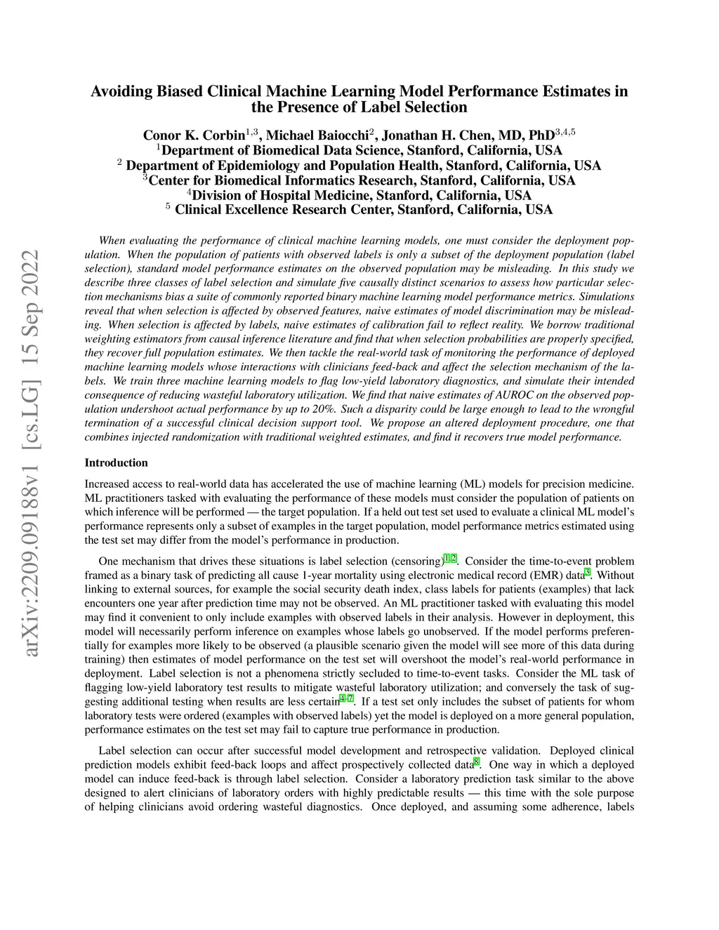 When evaluating the performance of clinical machine learning models, one must consider the deployment population. When the population of patients with observed labels is only a subset of the deployment population (label selection), standard model performance estimates on the observed population may be misleading. In this study we describe three classes of label selection and simulate five causally distinct scenarios to assess how particular selection mechanisms bias a suite of commonly reported binary machine learning model performance metrics. Simulations reveal that when selection is affected by observed features, naive estimates of model discrimination may be misleading. When selection is affected by labels, naive estimates of calibration fail to reflect reality. We borrow traditional weighting estimators from causal inference literature and find that when selection probabilities are properly specified, they recover full population estimates. We then tackle the real-world task of monitoring the performance of deployed machine learning models whose interactions with clinicians feed-back and affect the selection mechanism of the labels. We train three machine learning models to flag low-yield laboratory diagnostics, and simulate their intended consequence of reducing wasteful laboratory utilization. We find that naive estimates of AUROC on the observed population undershoot actual performance by up to 20%. Such a disparity could be large enough to lead to the wrongful termination of a successful clinical decision support tool. We propose an altered deployment procedure, one that combines injected randomization with traditional weighted estimates, and find it recovers true model performance.