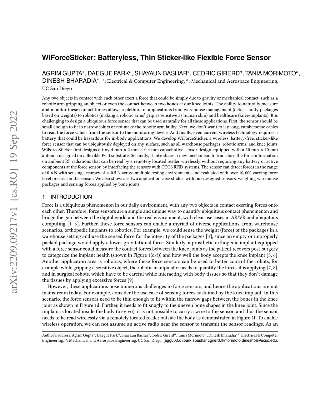 Any two objects in contact with each other exert a force that could be simply due to gravity or mechanical contact, such as a robotic arm gripping an object or even the contact between two bones at our knee joints. The ability to naturally measure and monitor these contact forces allows a plethora of applications from warehouse management (detect faulty packages based on weights) to robotics (making a robotic arms' grip as sensitive as human skin) and healthcare (knee-implants). It is challenging to design a ubiquitous force sensor that can be used naturally for all these applications. First, the sensor should be small enough to fit in narrow spaces. Next, we don't want to lay cumbersome cables to read the force values from the sensors. Finally, we need to have a battery-free design to meet the in-vivo applications. We develop WiForceSticker, a wireless, battery-free, sticker-like force sensor that can be ubiquitously deployed on any surface, such as all warehouse packages, robotic arms, and knee joints. WiForceSticker first designs a tiny ~mm~~~mm~~~mm capacitative sensor design equipped with a ~mm~~~mm antenna designed on a flexible PCB substrate. Secondly, it introduces a new mechanism to transduce the force information on ambient RF radiations that can be read by a remotely located reader wirelessly without requiring any battery or active components at the force sensor, by interfacing the sensors with COTS RFID systems. The sensor can detect forces in the range of -~N with sensing accuracy of ~N across multiple testing environments and evaluated with over varying force level presses on the sensor. We also showcase two application case studies with our designed sensors, weighing warehouse packages and sensing forces applied by bone joints.