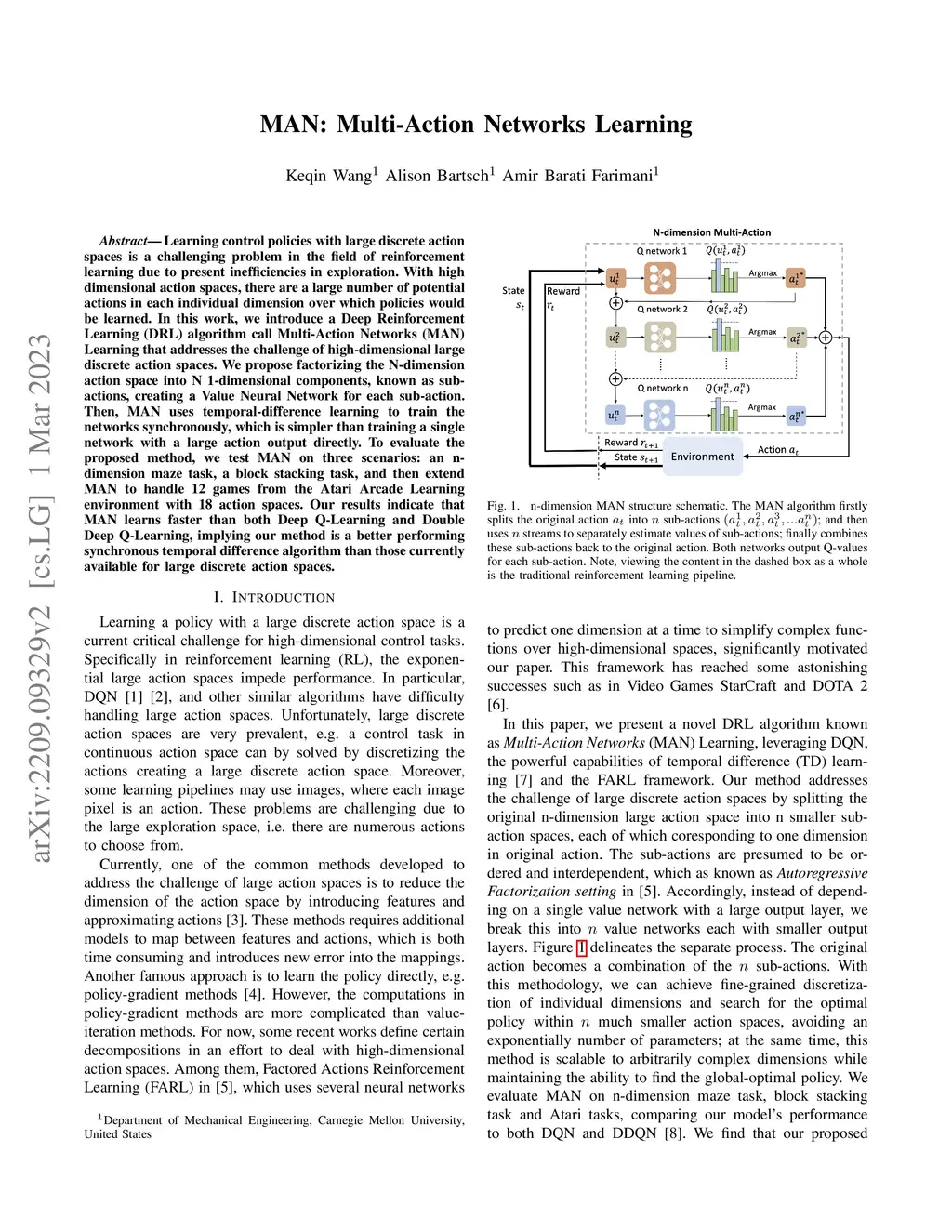 Learning control policies with large discrete action spaces is a challenging problem in the field of reinforcement learning due to present inefficiencies in exploration. With high dimensional action spaces, there are a large number of potential actions in each individual dimension over which policies would be learned. In this work, we introduce a Deep Reinforcement Learning (DRL) algorithm call Multi-Action Networks (MAN) Learning that addresses the challenge of high-dimensional large discrete action spaces. We propose factorizing the N-dimension action space into N 1-dimensional components, known as sub-actions, creating a Value Neural Network for each sub-action. Then, MAN uses temporal-difference learning to train the networks synchronously, which is simpler than training a single network with a large action output directly. To evaluate the proposed method, we test MAN on three scenarios: an n-dimension maze task, a block stacking task, and then extend MAN to handle 12 games from the Atari Arcade Learning environment with 18 action spaces. Our results indicate that MAN learns faster than both Deep Q-Learning and Double Deep Q-Learning, implying our method is a better performing synchronous temporal difference algorithm than those currently available for large discrete action spaces.