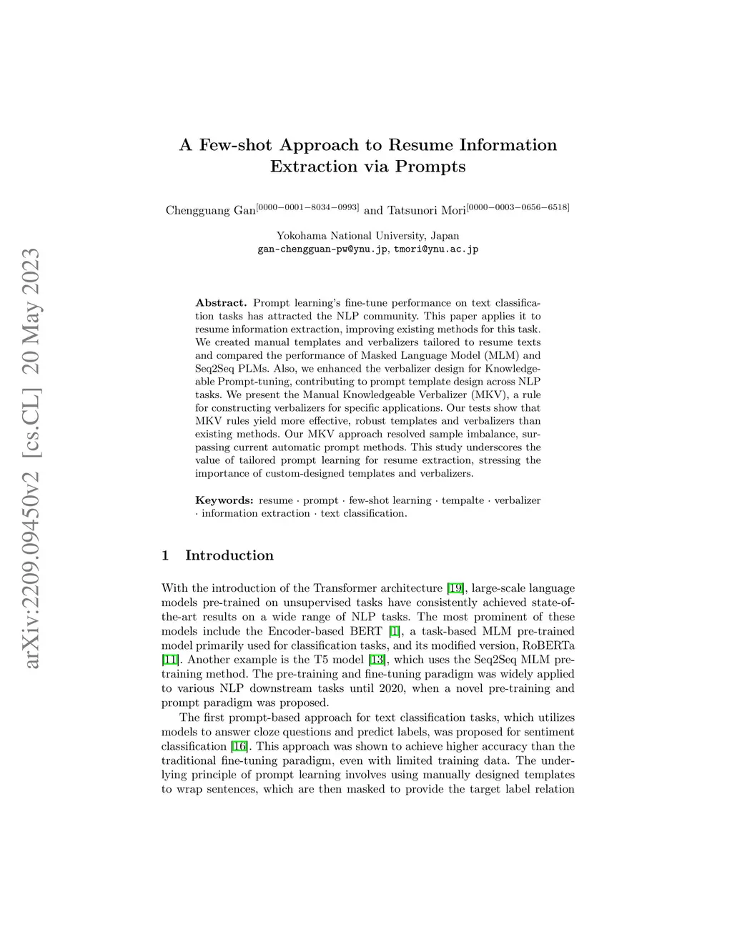 Prompt learning's fine-tune performance on text classification tasks has attracted the NLP community. This paper applies it to resume information extraction, improving existing methods for this task. We created manual templates and verbalizers tailored to resume texts and compared the performance of Masked Language Model (MLM) and Seq2Seq PLMs. Also, we enhanced the verbalizer design for Knowledgeable Prompt-tuning, contributing to prompt template design across NLP tasks. We present the Manual Knowledgeable Verbalizer (MKV), a rule for constructing verbalizers for specific applications. Our tests show that MKV rules yield more effective, robust templates and verbalizers than existing methods. Our MKV approach resolved sample imbalance, surpassing current automatic prompt methods. This study underscores the value of tailored prompt learning for resume extraction, stressing the importance of custom-designed templates and verbalizers.