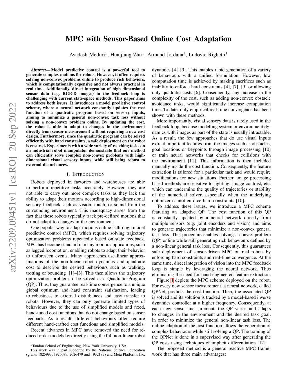 Model predictive control is a powerful tool to generate complex motions for robots. However, it often requires solving non-convex problems online to produce rich behaviors, which is computationally expensive and not always practical in real time. Additionally, direct integration of high dimensional sensor data (e.g. RGB-D images) in the feedback loop is challenging with current state-space methods. This paper aims to address both issues. It introduces a model predictive control scheme, where a neural network constantly updates the cost function of a quadratic program based on sensory inputs, aiming to minimize a general non-convex task loss without solving a non-convex problem online. By updating the cost, the robot is able to adapt to changes in the environment directly from sensor measurement without requiring a new cost design. Furthermore, since the quadratic program can be solved efficiently with hard constraints, a safe deployment on the robot is ensured. Experiments with a wide variety of reaching tasks on an industrial robot manipulator demonstrate that our method can efficiently solve complex non-convex problems with high-dimensional visual sensory inputs, while still being robust to external disturbances.