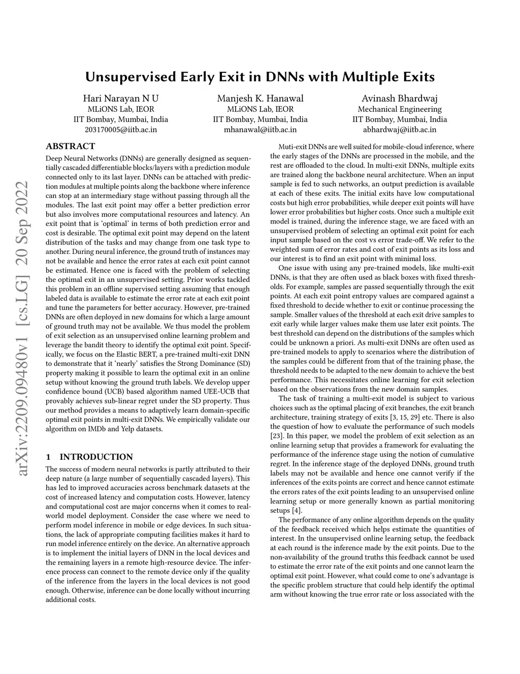 Deep Neural Networks (DNNs) are generally designed as sequentially cascaded differentiable blocks/layers with a prediction module connected only to its last layer. DNNs can be attached with prediction modules at multiple points along the backbone where inference can stop at an intermediary stage without passing through all the modules. The last exit point may offer a better prediction error but also involves more computational resources and latency. An exit point that is `optimal' in terms of both prediction error and cost is desirable. The optimal exit point may depend on the latent distribution of the tasks and may change from one task type to another. During neural inference, the ground truth of instances may not be available and error rates at each exit point cannot be estimated. Hence one is faced with the problem of selecting the optimal exit in an unsupervised setting. Prior works tackled this problem in an offline supervised setting assuming that enough labeled data is available to estimate the error rate at each exit point and tune the parameters for better accuracy. However, pre-trained DNNs are often deployed in new domains for which a large amount of ground truth may not be available. We model the problem of exit selection as an unsupervised online learning problem and use bandit theory to identify the optimal exit point. Specifically, we focus on Elastic BERT, a pre-trained multi-exit DNN to demonstrate that it `nearly' satisfies the Strong Dominance (SD) property making it possible to learn the optimal exit in an online setup without knowing the ground truth labels. We develop upper confidence bound (UCB) based algorithm named UEE-UCB that provably achieves sub-linear regret under the SD property. Thus our method provides a means to adaptively learn domain-specific optimal exit points in multi-exit DNNs. We empirically validate our algorithm on IMDb and Yelp datasets.