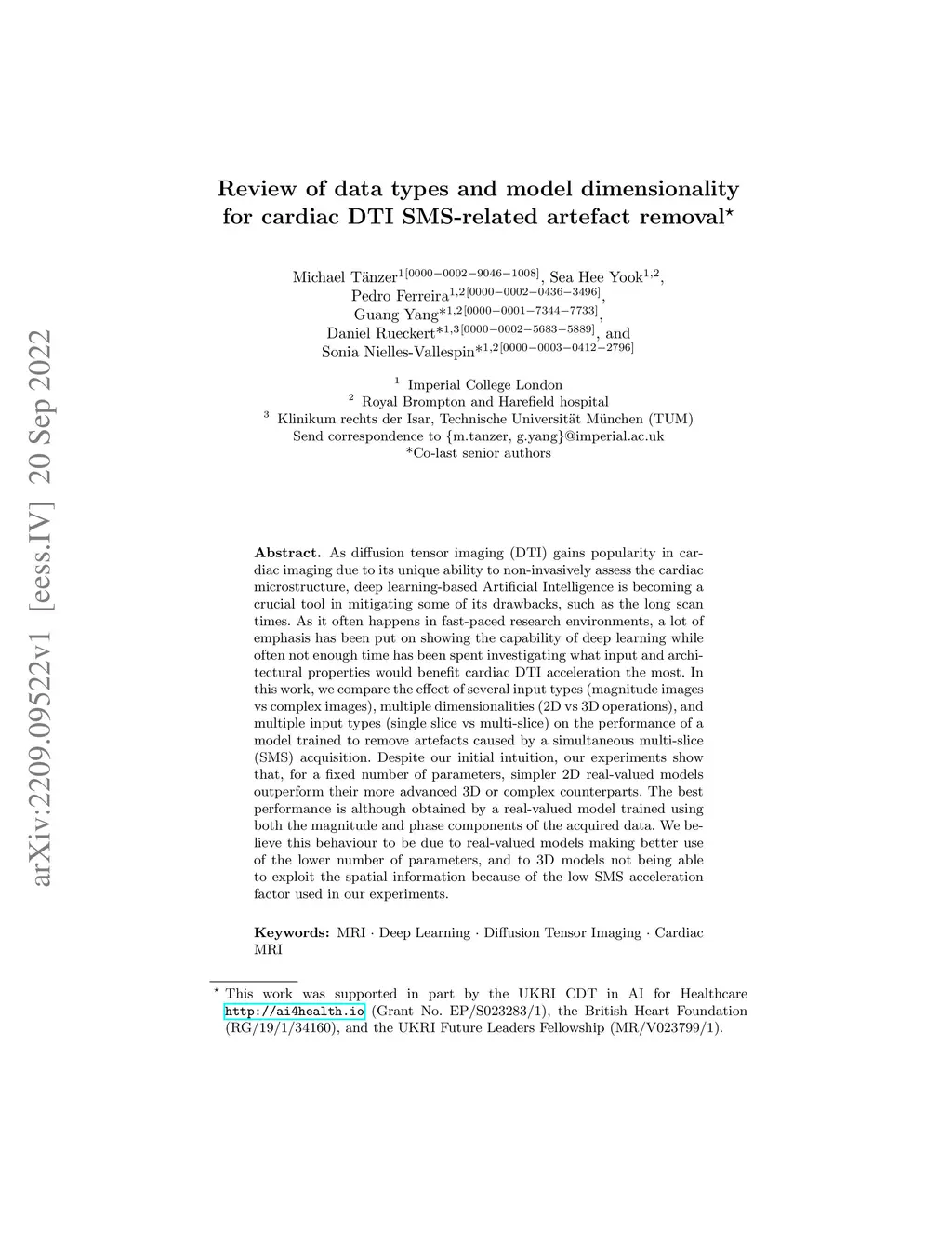 As diffusion tensor imaging (DTI) gains popularity in cardiac imaging due to its unique ability to non-invasively assess the cardiac microstructure, deep learning-based Artificial Intelligence is becoming a crucial tool in mitigating some of its drawbacks, such as the long scan times. As it often happens in fast-paced research environments, a lot of emphasis has been put on showing the capability of deep learning while often not enough time has been spent investigating what input and architectural properties would benefit cardiac DTI acceleration the most. In this work, we compare the effect of several input types (magnitude images vs complex images), multiple dimensionalities (2D vs 3D operations), and multiple input types (single slice vs multi-slice) on the performance of a model trained to remove artefacts caused by a simultaneous multi-slice (SMS) acquisition. Despite our initial intuition, our experiments show that, for a fixed number of parameters, simpler 2D real-valued models outperform their more advanced 3D or complex counterparts. The best performance is although obtained by a real-valued model trained using both the magnitude and phase components of the acquired data. We believe this behaviour to be due to real-valued models making better use of the lower number of parameters, and to 3D models not being able to exploit the spatial information because of the low SMS acceleration factor used in our experiments.