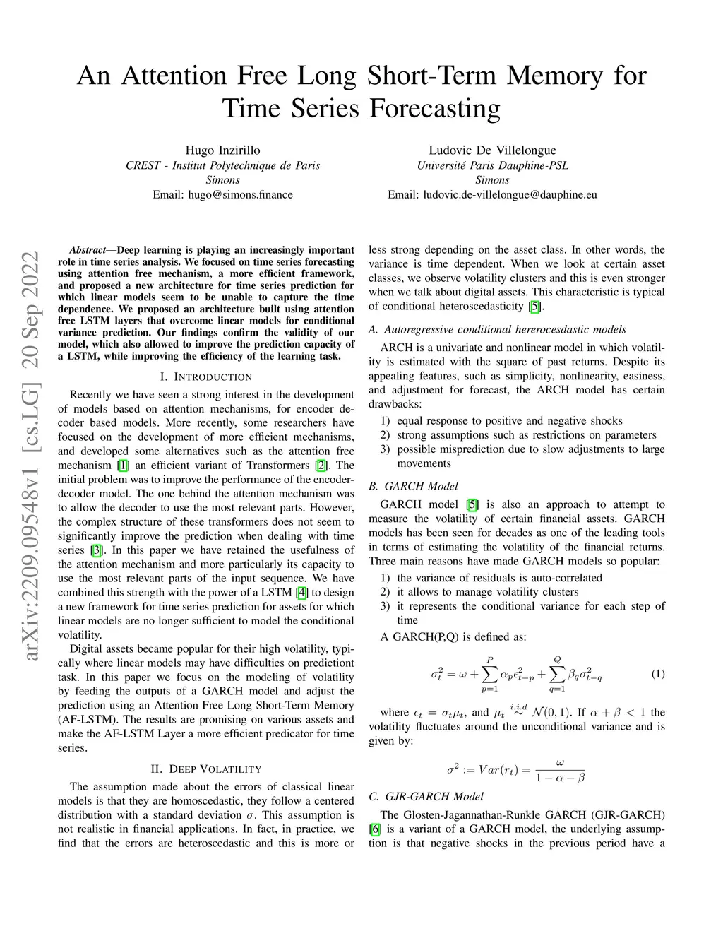 Deep learning is playing an increasingly important role in time series analysis. We focused on time series forecasting using attention free mechanism, a more efficient framework, and proposed a new architecture for time series prediction for which linear models seem to be unable to capture the time dependence. We proposed an architecture built using attention free LSTM layers that overcome linear models for conditional variance prediction. Our findings confirm the validity of our model, which also allowed to improve the prediction capacity of a LSTM, while improving the efficiency of the learning task.