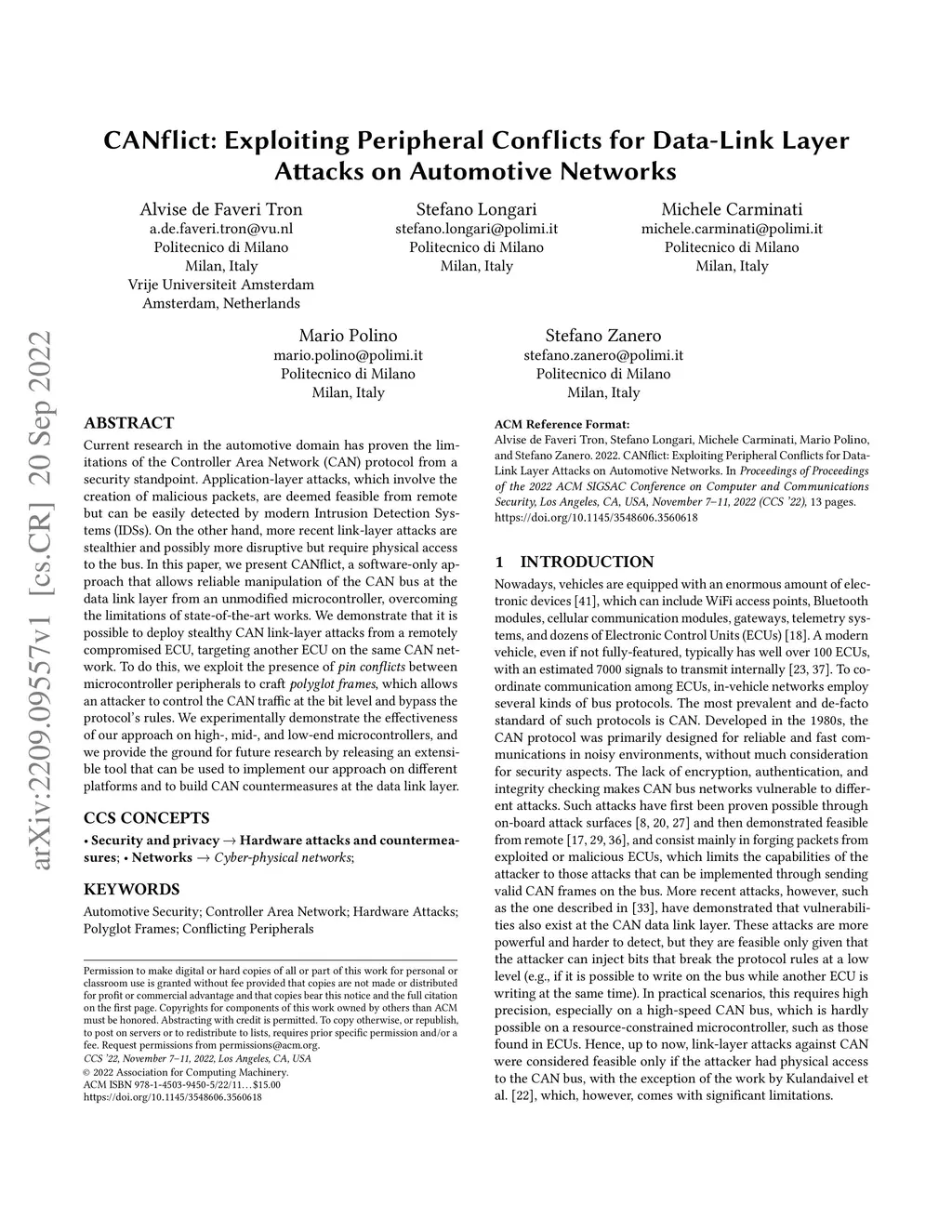 Current research in the automotive domain has proven the limitations of the CAN protocol from a security standpoint. Application-layer attacks, which involve the creation of malicious packets, are deemed feasible from remote but can be easily detected by modern IDS. On the other hand, more recent link-layer attacks are stealthier and possibly more disruptive but require physical access to the bus. In this paper, we present CANflict, a software-only approach that allows reliable manipulation of the CAN bus at the data link layer from an unmodified microcontroller, overcoming the limitations of state-of-the-art works. We demonstrate that it is possible to deploy stealthy CAN link-layer attacks from a remotely compromised ECU, targeting another ECU on the same CAN network. To do this, we exploit the presence of pin conflicts between microcontroller peripherals to craft polyglot frames, which allows an attacker to control the CAN traffic at the bit level and bypass the protocol's rules. We experimentally demonstrate the effectiveness of our approach on high-, mid-, and low-end microcontrollers, and we provide the ground for future research by releasing an extensible tool that can be used to implement our approach on different platforms and to build CAN countermeasures at the data link layer.