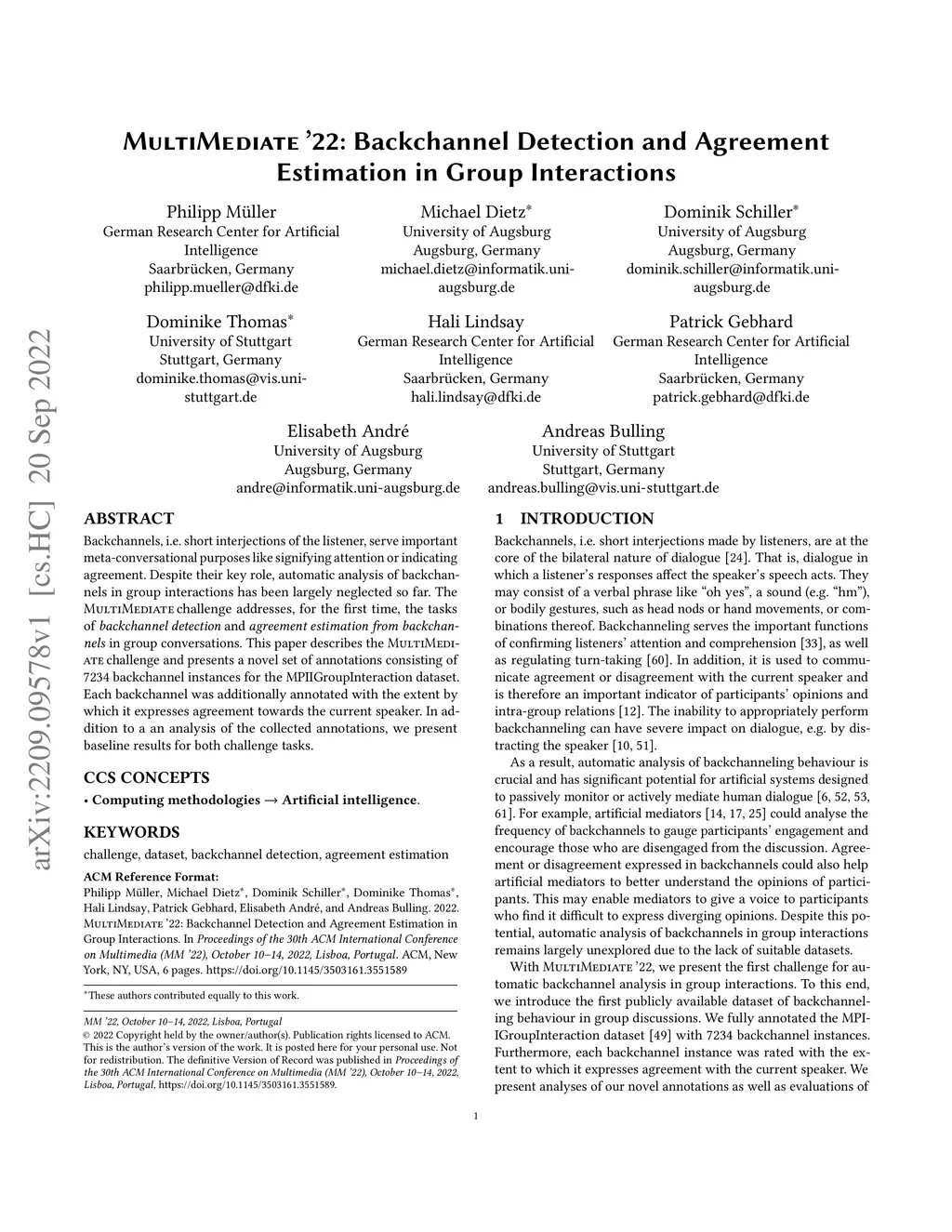 MultiMediate '22: Backchannel Detection and Agreement Estimation in