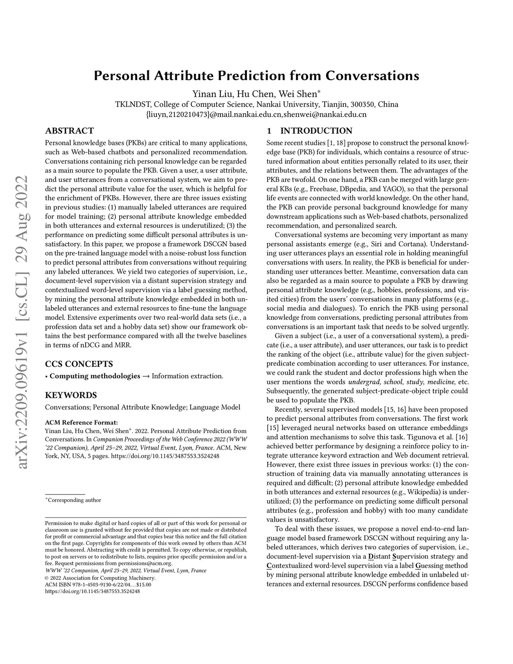 Personal knowledge bases (PKBs) are critical to many applications, such as Web-based chatbots and personalized recommendation. Conversations containing rich personal knowledge can be regarded as a main source to populate the PKB. Given a user, a user attribute, and user utterances from a conversational system, we aim to predict the personal attribute value for the user, which is helpful for the enrichment of PKBs. However, there are three issues existing in previous studies: (1) manually labeled utterances are required for model training; (2) personal attribute knowledge embedded in both utterances and external resources is underutilized; (3) the performance on predicting some difficult personal attributes is unsatisfactory. In this paper, we propose a framework DSCGN based on the pre-trained language model with a noise-robust loss function to predict personal attributes from conversations without requiring any labeled utterances. We yield two categories of supervision, i.e., document-level supervision via a distant supervision strategy and contextualized word-level supervision via a label guessing method, by mining the personal attribute knowledge embedded in both unlabeled utterances and external resources to fine-tune the language model. Extensive experiments over two real-world data sets (i.e., a profession data set and a hobby data set) show our framework obtains the best performance compared with all the twelve baselines in terms of nDCG and MRR.