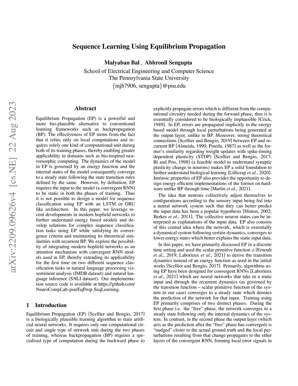 Equilibrium Propagation (EP) is a powerful and more bio-plausible alternative to conventional learning frameworks such as backpropagation. The effectiveness of EP stems from the fact that it relies only on local computations and requires solely one kind of computational unit during both of its training phases, thereby enabling greater applicability in domains such as bio-inspired neuromorphic computing. The dynamics of the model in EP is governed by an energy function and the internal states of the model consequently converge to a steady state following the state transition rules defined by the same. However, by definition, EP requires the input to the model (a convergent RNN) to be static in both the phases of training. Thus it is not possible to design a model for sequence classification using EP with an LSTM or GRU like architecture. In this paper, we leverage recent developments in modern hopfield networks to further understand energy based models and develop solutions for complex sequence classification tasks using EP while satisfying its convergence criteria and maintaining its theoretical similarities with recurrent backpropagation. We explore the possibility of integrating modern hopfield networks as an attention mechanism with convergent RNN models used in EP, thereby extending its applicability for the first time on two different sequence classification tasks in natural language processing viz. sentiment analysis (IMDB dataset) and natural language inference (SNLI dataset).