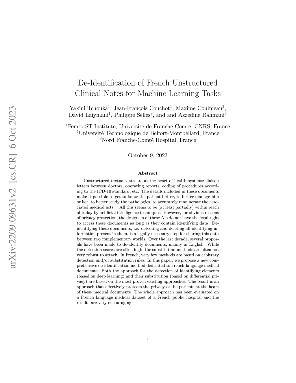 De-Identification of French Unstructured Clinical Notes for Machine