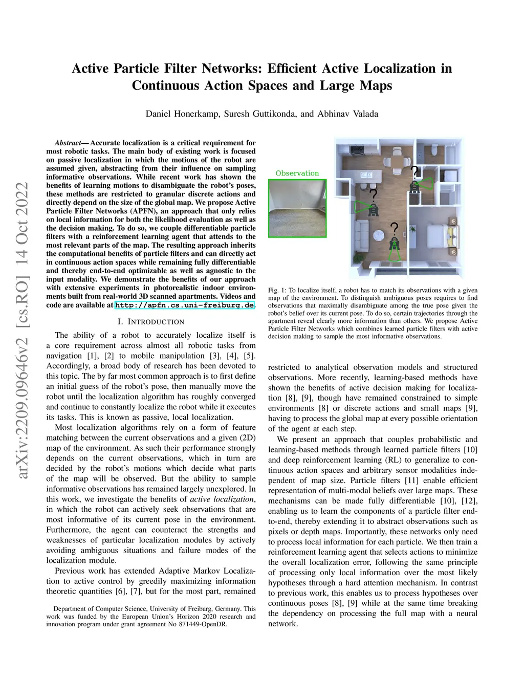 Accurate localization is a critical requirement for most robotic tasks. The main body of existing work is focused on passive localization in which the motions of the robot are assumed given, abstracting from their influence on sampling informative observations. While recent work has shown the benefits of learning motions to disambiguate the robot's poses, these methods are restricted to granular discrete actions and directly depend on the size of the global map. We propose Active Particle Filter Networks (APFN), an approach that only relies on local information for both the likelihood evaluation as well as the decision making. To do so, we couple differentiable particle filters with a reinforcement learning agent that attends to the most relevant parts of the map. The resulting approach inherits the computational benefits of particle filters and can directly act in continuous action spaces while remaining fully differentiable and thereby end-to-end optimizable as well as agnostic to the input modality. We demonstrate the benefits of our approach with extensive experiments in photorealistic indoor environments built from real-world 3D scanned apartments. Videos and code are available at http://apfn.cs.uni-freiburg.de.