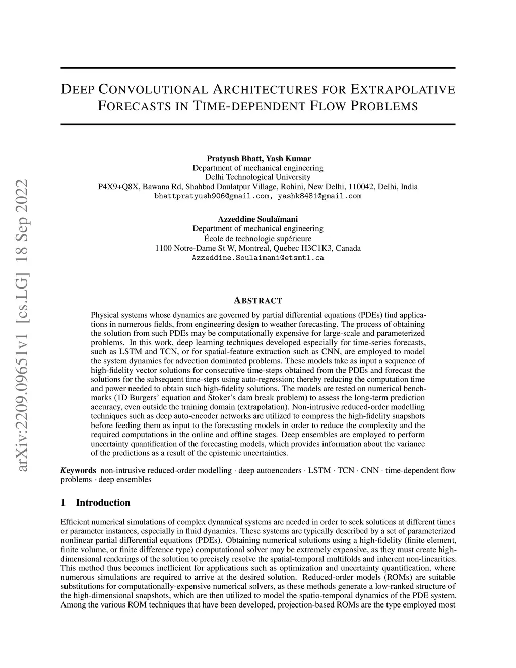 Physical systems whose dynamics are governed by partial differential equations (PDEs) find applications in numerous fields, from engineering design to weather forecasting. The process of obtaining the solution from such PDEs may be computationally expensive for large-scale and parameterized problems. In this work, deep learning techniques developed especially for time-series forecasts, such as LSTM and TCN, or for spatial-feature extraction such as CNN, are employed to model the system dynamics for advection dominated problems. These models take as input a sequence of high-fidelity vector solutions for consecutive time-steps obtained from the PDEs and forecast the solutions for the subsequent time-steps using auto-regression; thereby reducing the computation time and power needed to obtain such high-fidelity solutions. The models are tested on numerical benchmarks (1D Burgers' equation and Stoker's dam break problem) to assess the long-term prediction accuracy, even outside the training domain (extrapolation). Non-intrusive reduced-order modelling techniques such as deep auto-encoder networks are utilized to compress the high-fidelity snapshots before feeding them as input to the forecasting models in order to reduce the complexity and the required computations in the online and offline stages. Deep ensembles are employed to perform uncertainty quantification of the forecasting models, which provides information about the variance of the predictions as a result of the epistemic uncertainties.