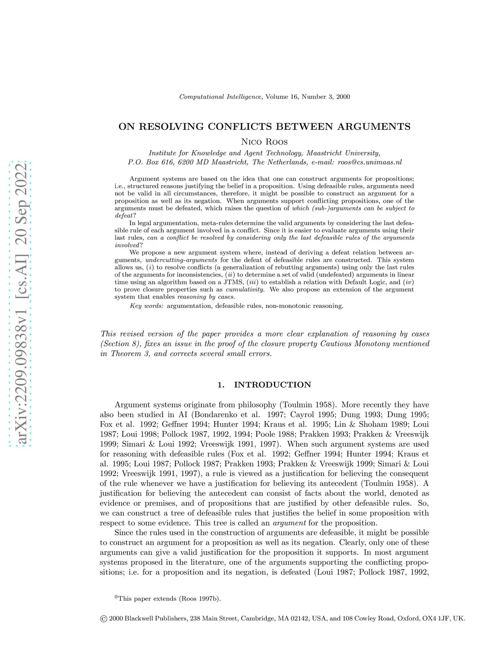 Argument systems are based on the idea that one can construct arguments for propositions; i.e., structured reasons justifying the belief in a proposition. Using defeasible rules, arguments need not be valid in all circumstances, therefore, it might be possible to construct an argument for a proposition as well as its negation. When arguments support conflicting propositions, one of the arguments must be defeated, which raises the question of \emph{which (sub-)arguments can be subject to defeat}? In legal argumentation, meta-rules determine the valid arguments by considering the last defeasible rule of each argument involved in a conflict. Since it is easier to evaluate arguments using their last rules, \emph{can a conflict be resolved by considering only the last defeasible rules of the arguments involved}? We propose a new argument system where, instead of deriving a defeat relation between arguments, \emph{undercutting-arguments} for the defeat of defeasible rules are constructed. This system allows us, (\textit{i}) to resolve conflicts (a generalization of rebutting arguments) using only the last rules of the arguments for inconsistencies, (\textit{ii}) to determine a set of valid (undefeated) arguments in linear time using an algorithm based on a JTMS, (\textit{iii}) to establish a relation with Default Logic, and (\textit{iv}) to prove closure properties such as \emph{cumulativity}. We also propose an extension of the argument system that enables \emph{reasoning by cases}.