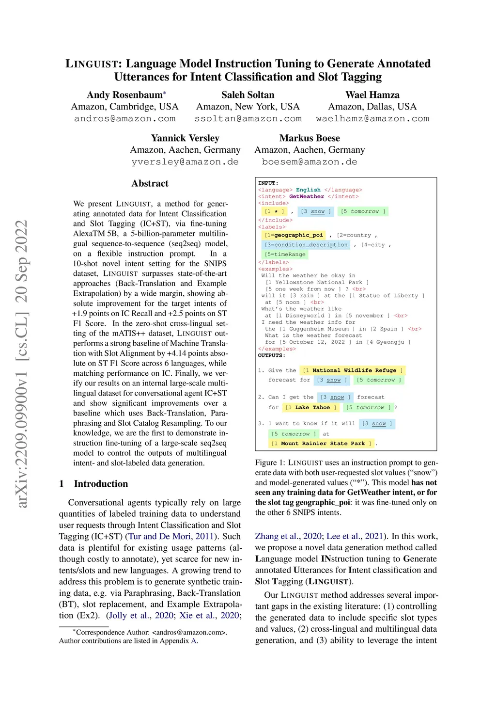We present LINGUIST, a method for generating annotated data for Intent Classification and Slot Tagging (IC+ST), via fine-tuning AlexaTM 5B, a 5-billion-parameter multilingual sequence-to-sequence (seq2seq) model, on a flexible instruction prompt. In a 10-shot novel intent setting for the SNIPS dataset, LINGUIST surpasses state-of-the-art approaches (Back-Translation and Example Extrapolation) by a wide margin, showing absolute improvement for the target intents of +1.9 points on IC Recall and +2.5 points on ST F1 Score. In the zero-shot cross-lingual setting of the mATIS++ dataset, LINGUIST out-performs a strong baseline of Machine Translation with Slot Alignment by +4.14 points absolute on ST F1 Score across 6 languages, while matching performance on IC. Finally, we verify our results on an internal large-scale multilingual dataset for conversational agent IC+ST and show significant improvements over a baseline which uses Back-Translation, Paraphrasing and Slot Catalog Resampling. To our knowledge, we are the first to demonstrate instruction fine-tuning of a large-scale seq2seq model to control the outputs of multilingual intent- and slot-labeled data generation.