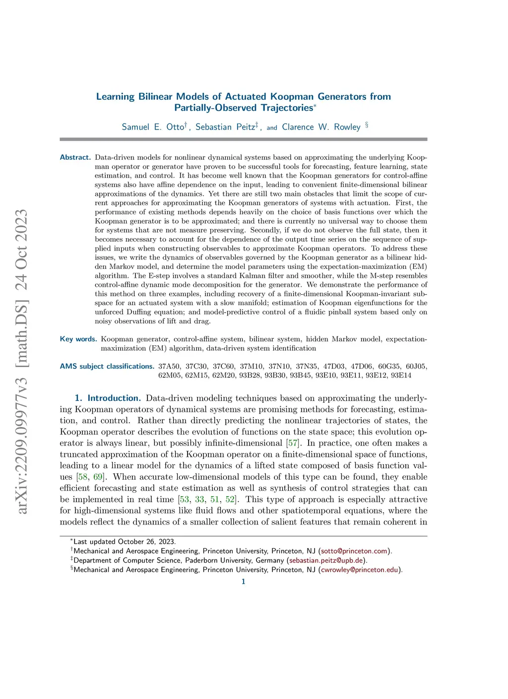 Data-driven models for nonlinear dynamical systems based on approximating the underlying Koopman operator or generator have proven to be successful tools for forecasting, feature learning, state estimation, and control. It has become well known that the Koopman generators for control-affine systems also have affine dependence on the input, leading to convenient finite-dimensional bilinear approximations of the dynamics. Yet there are still two main obstacles that limit the scope of current approaches for approximating the Koopman generators of systems with actuation. First, the performance of existing methods depends heavily on the choice of basis functions over which the Koopman generator is to be approximated; and there is currently no universal way to choose them for systems that are not measure preserving. Secondly, if we do not observe the full state, then it becomes necessary to account for the dependence of the output time series on the sequence of supplied inputs when constructing observables to approximate Koopman operators. To address these issues, we write the dynamics of observables governed by the Koopman generator as a bilinear hidden Markov model, and determine the model parameters using the expectation-maximization (EM) algorithm. The E-step involves a standard Kalman filter and smoother, while the M-step resembles control-affine dynamic mode decomposition for the generator. We demonstrate the performance of this method on three examples, including recovery of a finite-dimensional Koopman-invariant subspace for an actuated system with a slow manifold; estimation of Koopman eigenfunctions for the unforced Duffing equation; and model-predictive control of a fluidic pinball system based only on noisy observations of lift and drag.