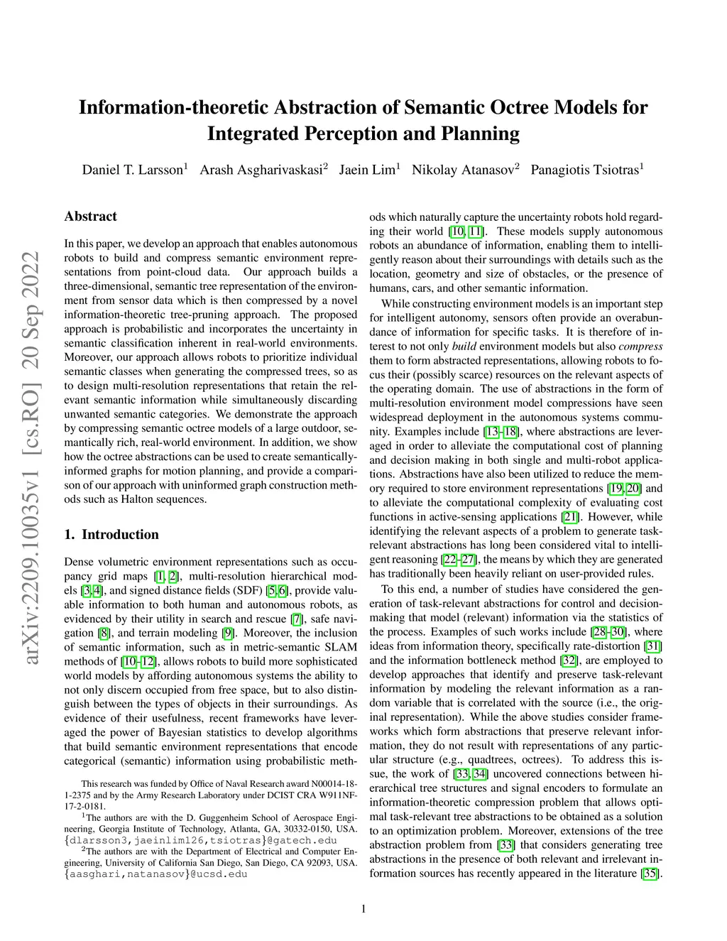 In this paper, we develop an approach that enables autonomous robots to build and compress semantic environment representations from point-cloud data. Our approach builds a three-dimensional, semantic tree representation of the environment from sensor data which is then compressed by a novel information-theoretic tree-pruning approach. The proposed approach is probabilistic and incorporates the uncertainty in semantic classification inherent in real-world environments. Moreover, our approach allows robots to prioritize individual semantic classes when generating the compressed trees, so as to design multi-resolution representations that retain the relevant semantic information while simultaneously discarding unwanted semantic categories. We demonstrate the approach by compressing semantic octree models of a large outdoor, semantically rich, real-world environment. In addition, we show how the octree abstractions can be used to create semantically-informed graphs for motion planning, and provide a comparison of our approach with uninformed graph construction methods such as Halton sequences.