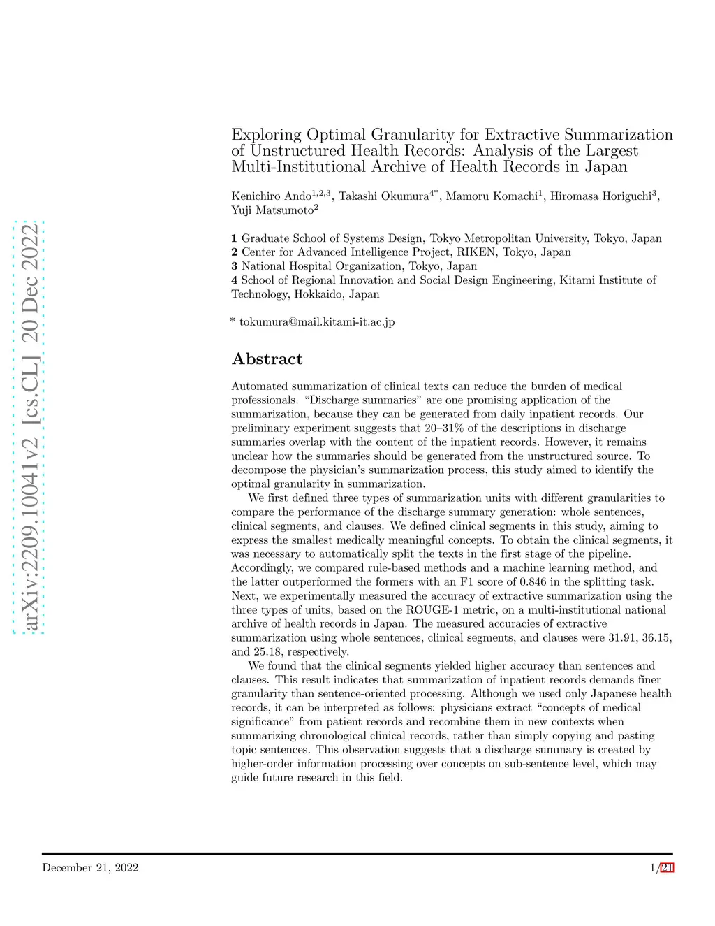 Automated summarization of clinical texts can reduce the burden of medical professionals. "Discharge summaries" are one promising application of the summarization, because they can be generated from daily inpatient records. Our preliminary experiment suggests that 20-31% of the descriptions in discharge summaries overlap with the content of the inpatient records. However, it remains unclear how the summaries should be generated from the unstructured source. To decompose the physician's summarization process, this study aimed to identify the optimal granularity in summarization. We first defined three types of summarization units with different granularities to compare the performance of the discharge summary generation: whole sentences, clinical segments, and clauses. We defined clinical segments in this study, aiming to express the smallest medically meaningful concepts. To obtain the clinical segments, it was necessary to automatically split the texts in the first stage of the pipeline. Accordingly, we compared rule-based methods and a machine learning method, and the latter outperformed the formers with an F1 score of 0.846 in the splitting task. Next, we experimentally measured the accuracy of extractive summarization using the three types of units, based on the ROUGE-1 metric, on a multi-institutional national archive of health records in Japan. The measured accuracies of extractive summarization using whole sentences, clinical segments, and clauses were 31.91, 36.15, and 25.18, respectively. We found that the clinical segments yielded higher accuracy than sentences and clauses. This result indicates that summarization of inpatient records demands finer granularity than sentence-oriented processing. Although we used only Japanese health records, it can be interpreted as follows: physicians extract "concepts of medical significance" from patient records and recombine them ...